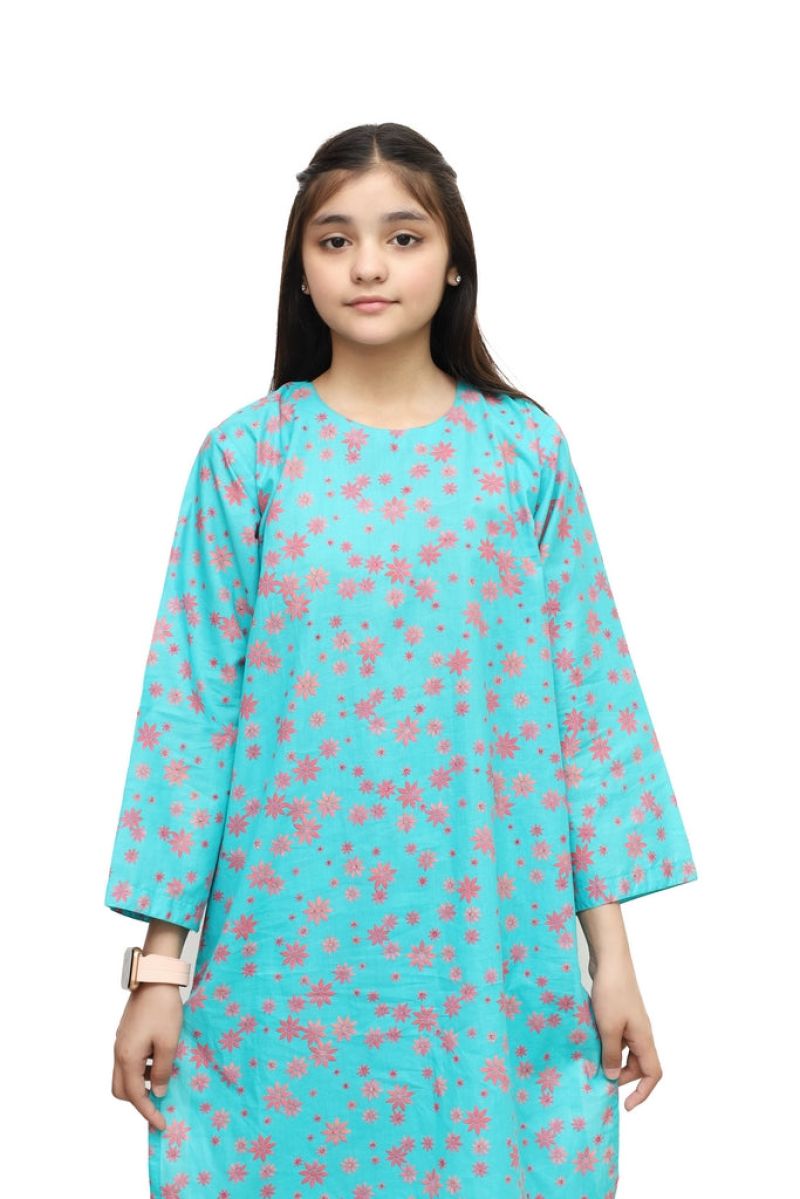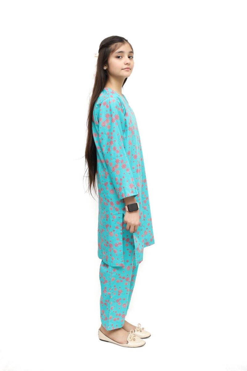 Elevate your girl's wardrobe with this stunning 2-piece stitched suit from Plum. Crafted from premium digital lawn fabric in a refreshing sea green shade, it features delicate pink flower prints that add a charming, feminine touch. The suit comes fully stitched and ready to wear, offering comfort and style for everyday occasions, celebrations, or family gatherings. The soft, breathable fabric ensures all-day comfort, while the vibrant print makes it a standout piece. Perfect for girls who love traditional wear with a modern twist.