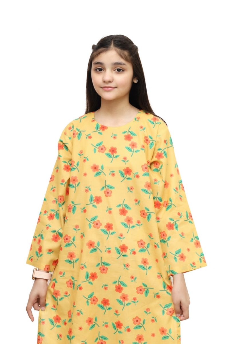 Brighten your girl's wardrobe with this charming 2-piece stitched suit from Plum. Crafted from soft digital lawn fabric in a cheerful yellow base, it features delicate peach and green floral prints that add a playful, feminine touch. The pre-stitched design ensures a perfect fit and saves you time on tailoring. Ideal for casual wear, family gatherings, or special occasions, this suit combines comfort