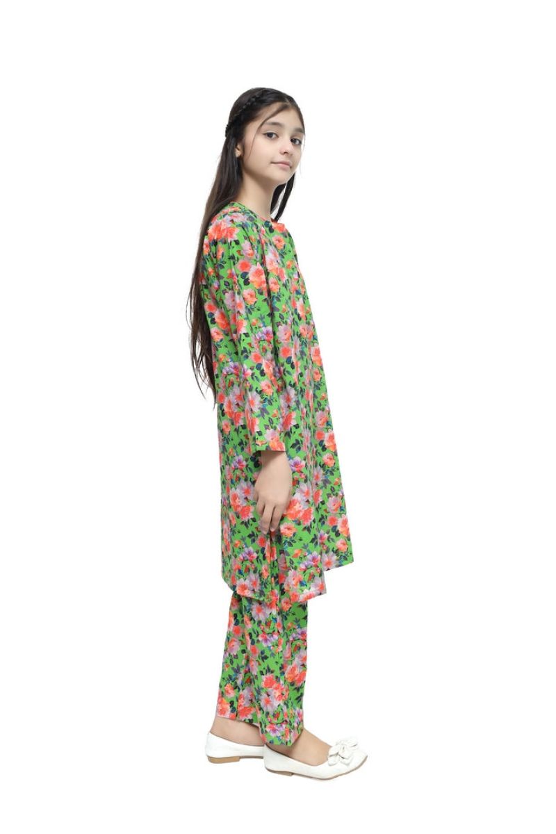 Liven up your little one's wardrobe with our Premium Quality Fine Lawn Bright GreenColour Printed with Lavender Peach Blue Coloured Flowers on 2 pc suit ! Made from premium 100% Cotton for Summer, this suit is not only high-quality, but also comfortable for all-day wear Casuals and Formals. Perfect for any stylish girl, this 2 pc suit is a must-have.