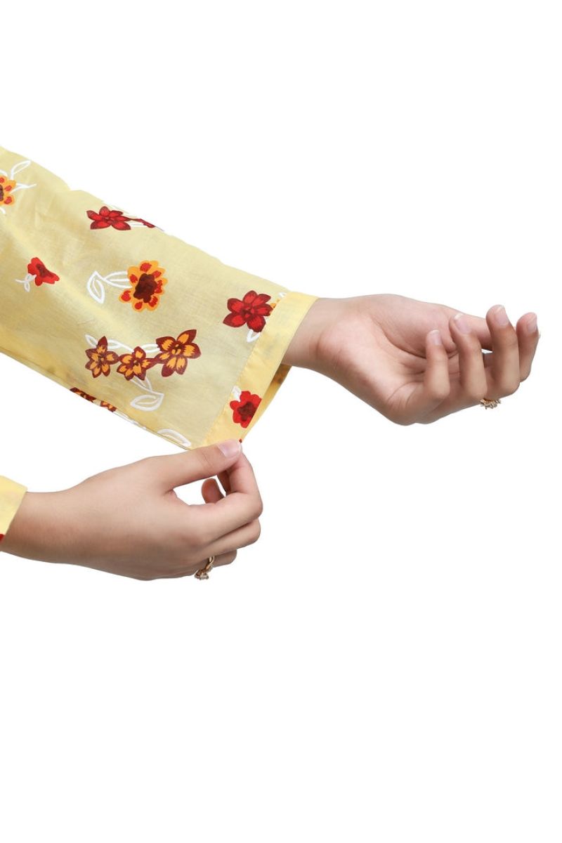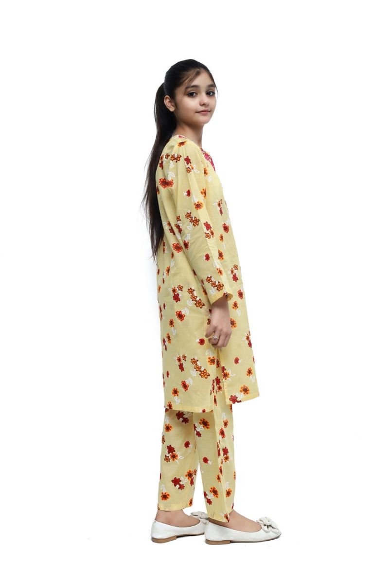 Liven up your little one's wardrobe with our Premium Quality Fine Lawn Light Yellow Colour Printed with Red Mustard White Flowers Embroidered Pink threads on 2 pc suit ! Made from premium 100% Cotton for Summer, this suit is not only high-quality, but also comfortable for all-day wear Casuals and Formals. Perfect for any stylish girl, this 2 pc suit is a must-have.