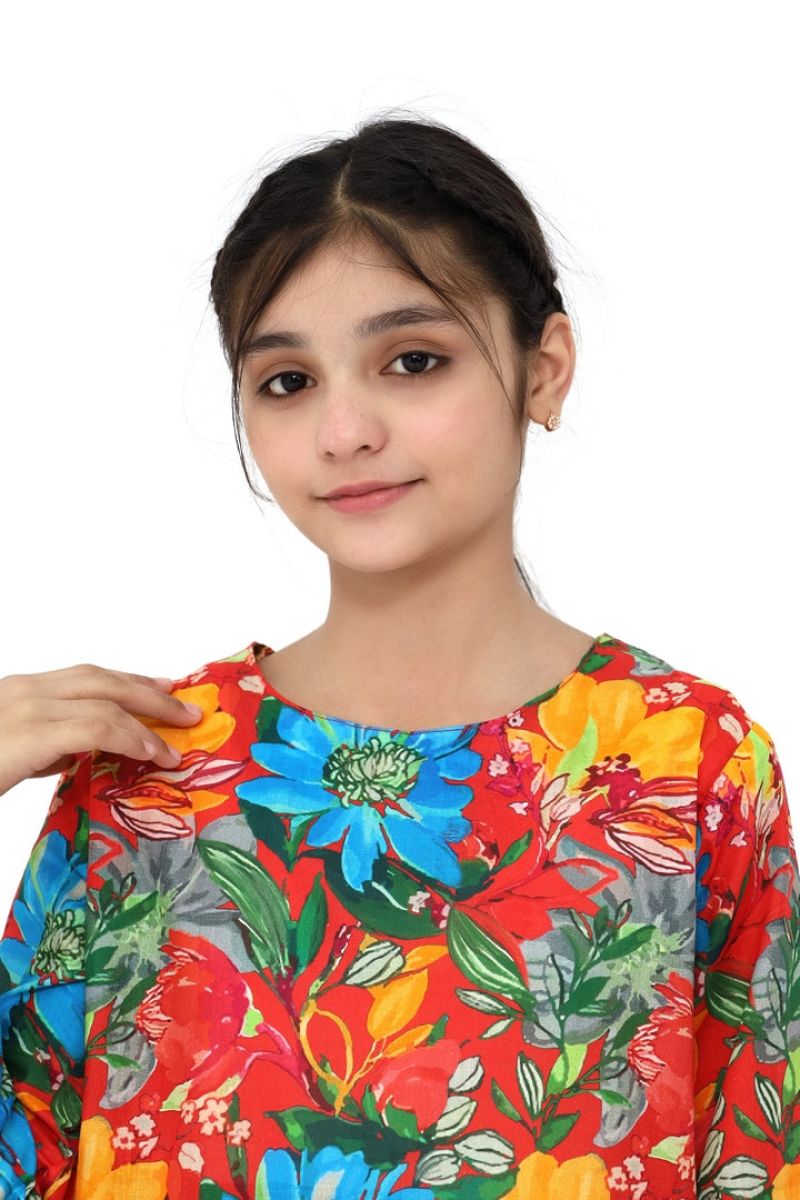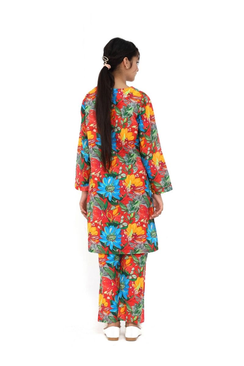 Liven up your little one's wardrobe with our Premium Quality Fine Lawn Red Carrot Colour Printed with Blue Orange Yellow Green Coloured Flowers on 2 pc suit ! Made from premium 100% Cotton for Summer, this suit is not only high-quality, but also comfortable for all-day wear Casuals and Formals. Perfect for any stylish girl, this 2 pc suit is a must-have.
