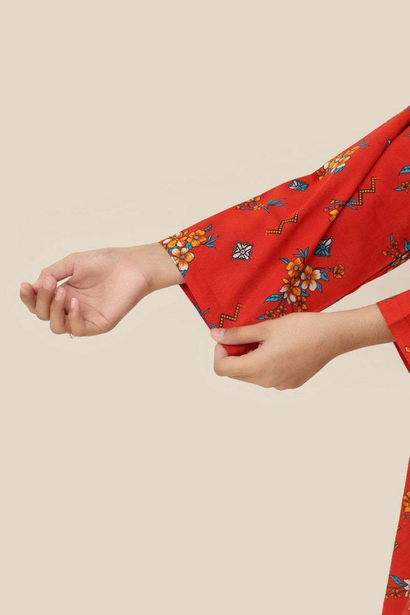 Liven up your little one's wardrobe with our Premium Quality Khaddar Colour Red Orange, Printed with Yellow Blue White Flowers on 2 pc suit ! For Winters, this suit is not only high-quality, but also comfortable for all-day wear Casuals and Formals. Perfect for any stylish girl, this Stitched 2 pc suit is a must-have.
