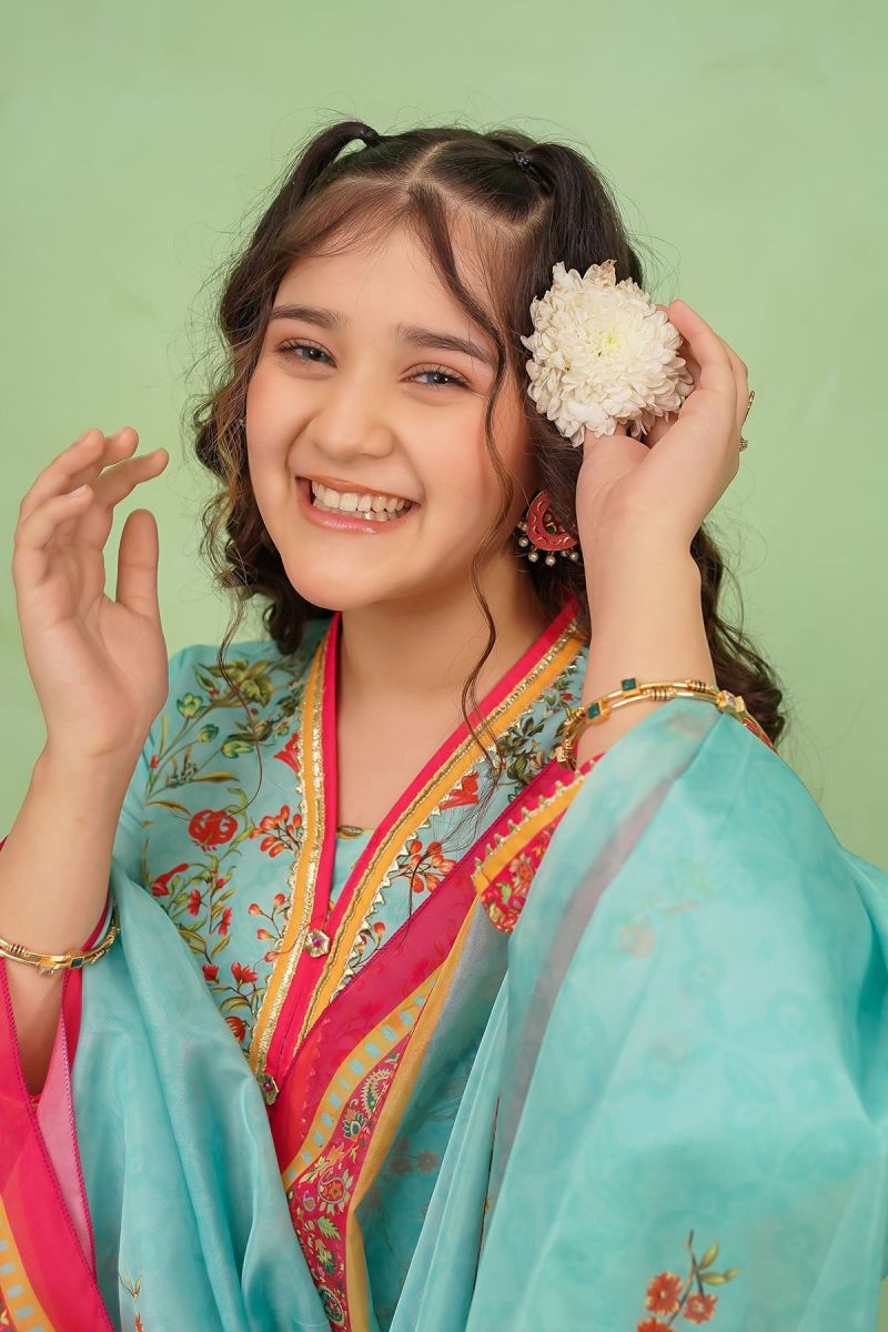 Top: Blue Poly Lawn Digital Printed Coat Style Kurta with Gota Laces and Tassels