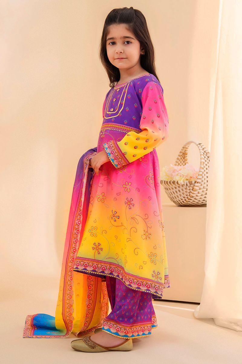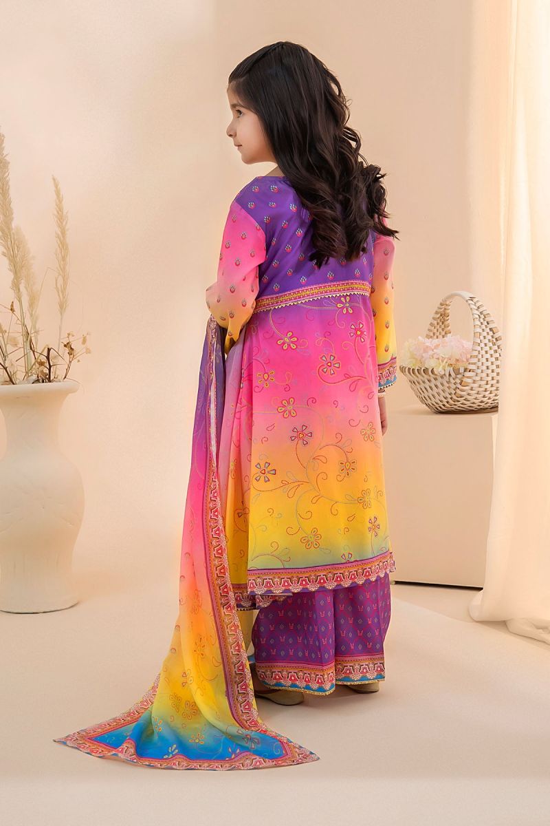 Top: Purple, Pink and Lemon Yellow Tie and Dye Poly Lawn Digital Printed Kurta