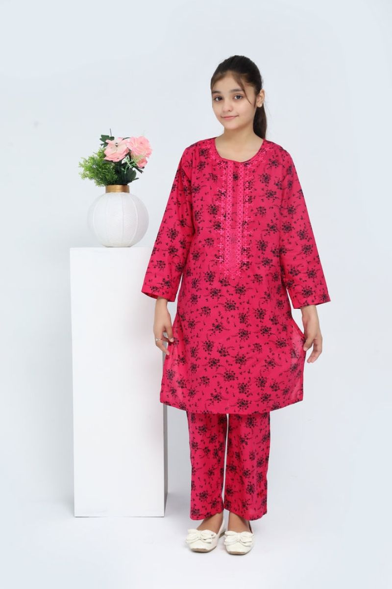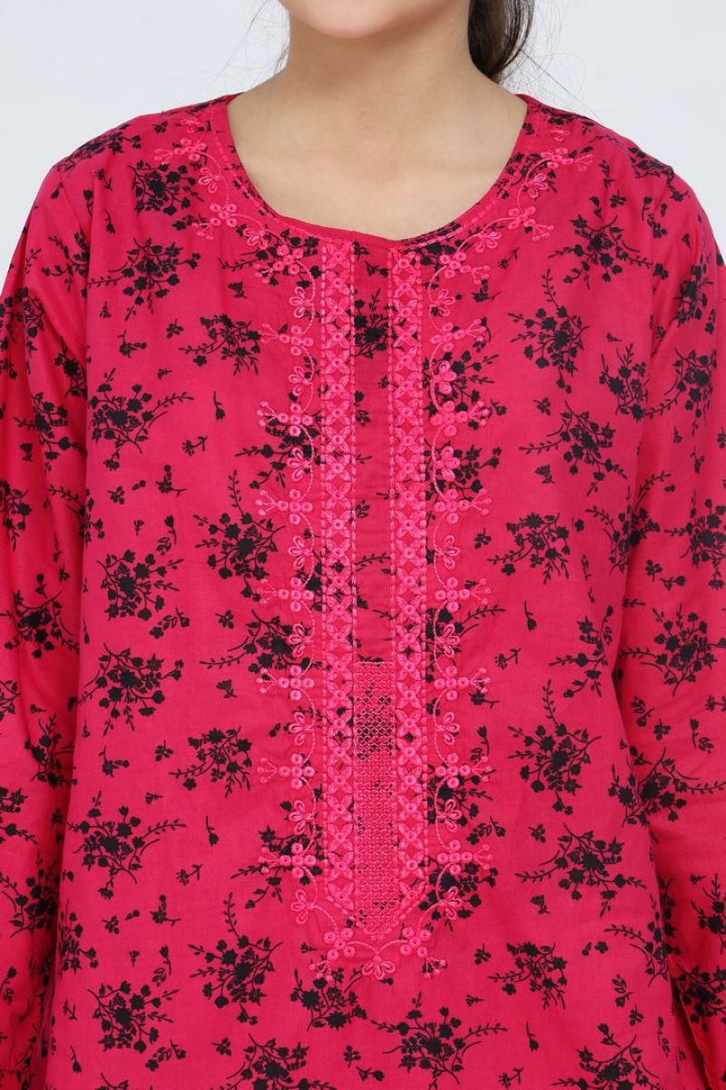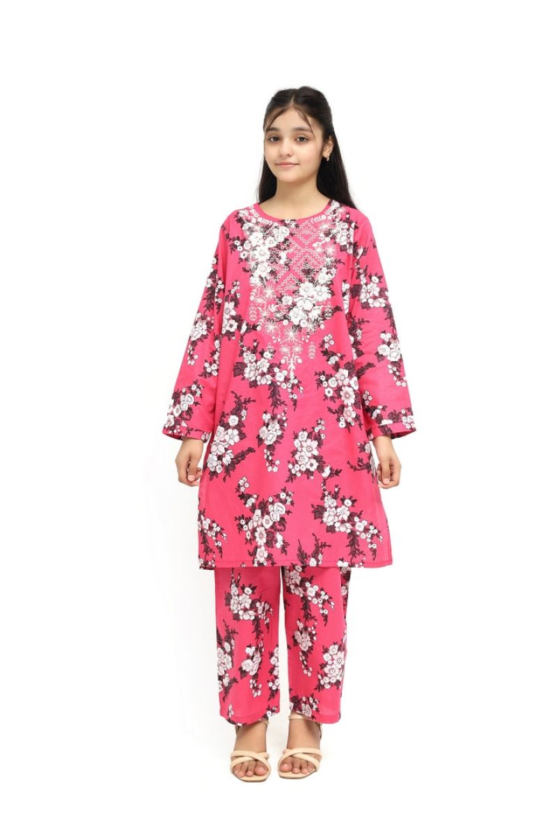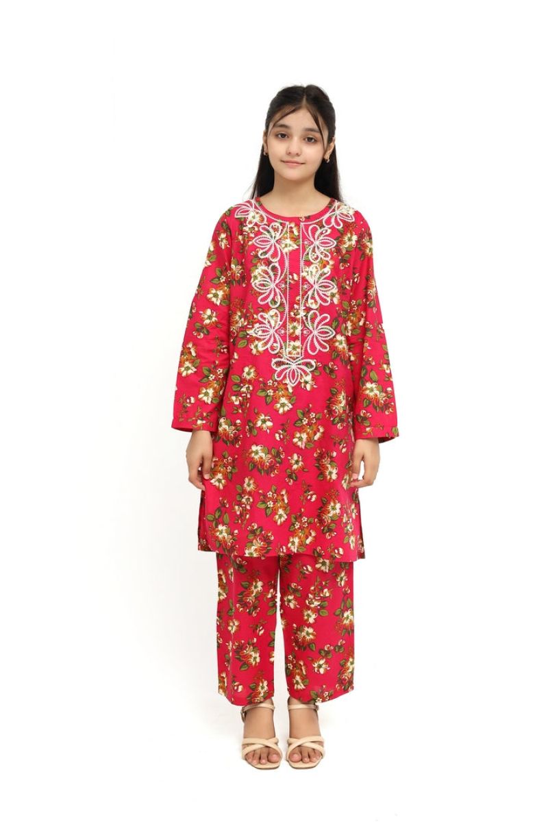 Plum 100% Cotton Lawn Pink Colour Printed Red Yellow Flowers Embroidered Dark Pink threads On Stitched 2 pc suit for Girls.