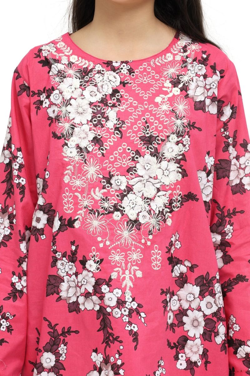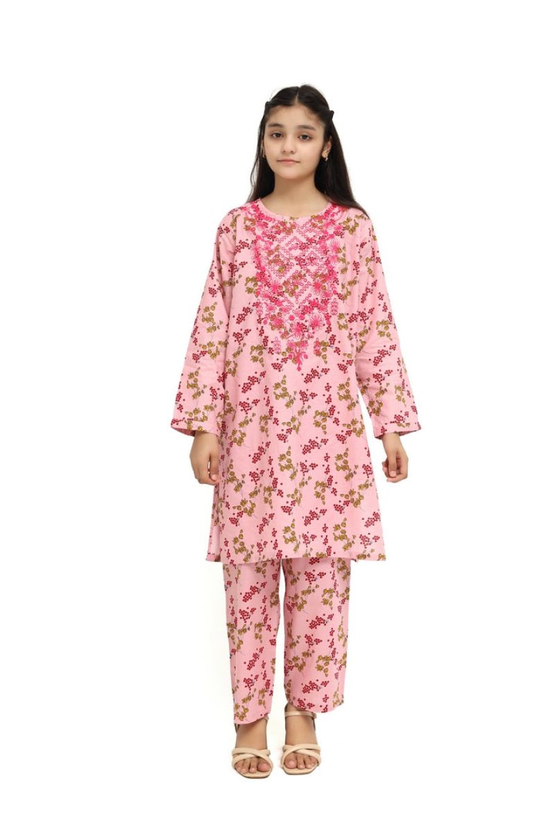Plum 100% Cotton Lawn Pink Colour Printed White Burgundy Flowers Embroidered White threads On Stitched 2 pc suit for Girls.