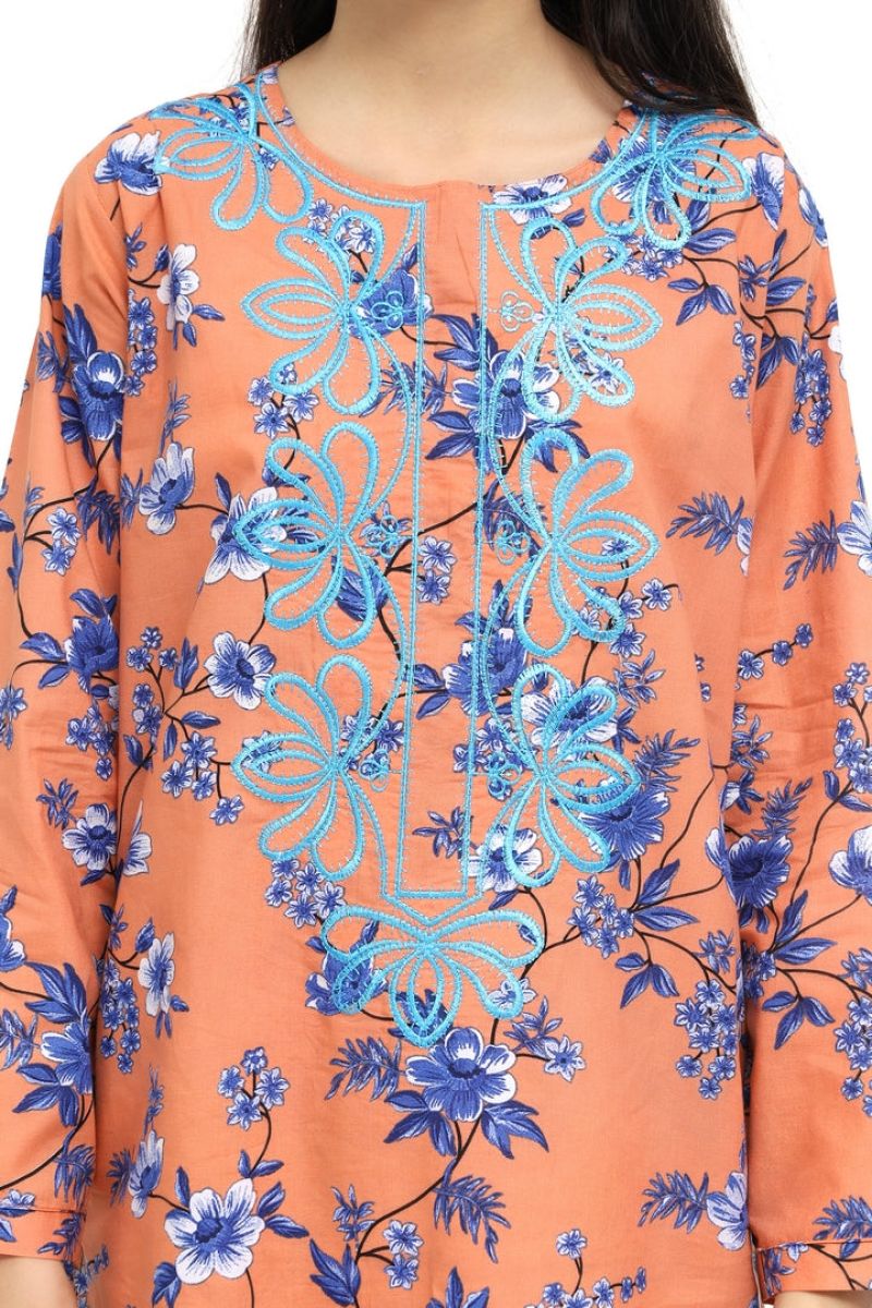 Plum 100% Cotton Lawn Peach Colour Printed Blue White Flowers Embroidered Blue threads On Stitched 2 pc suit for Girls.