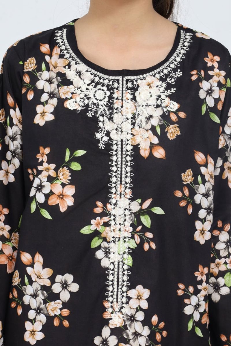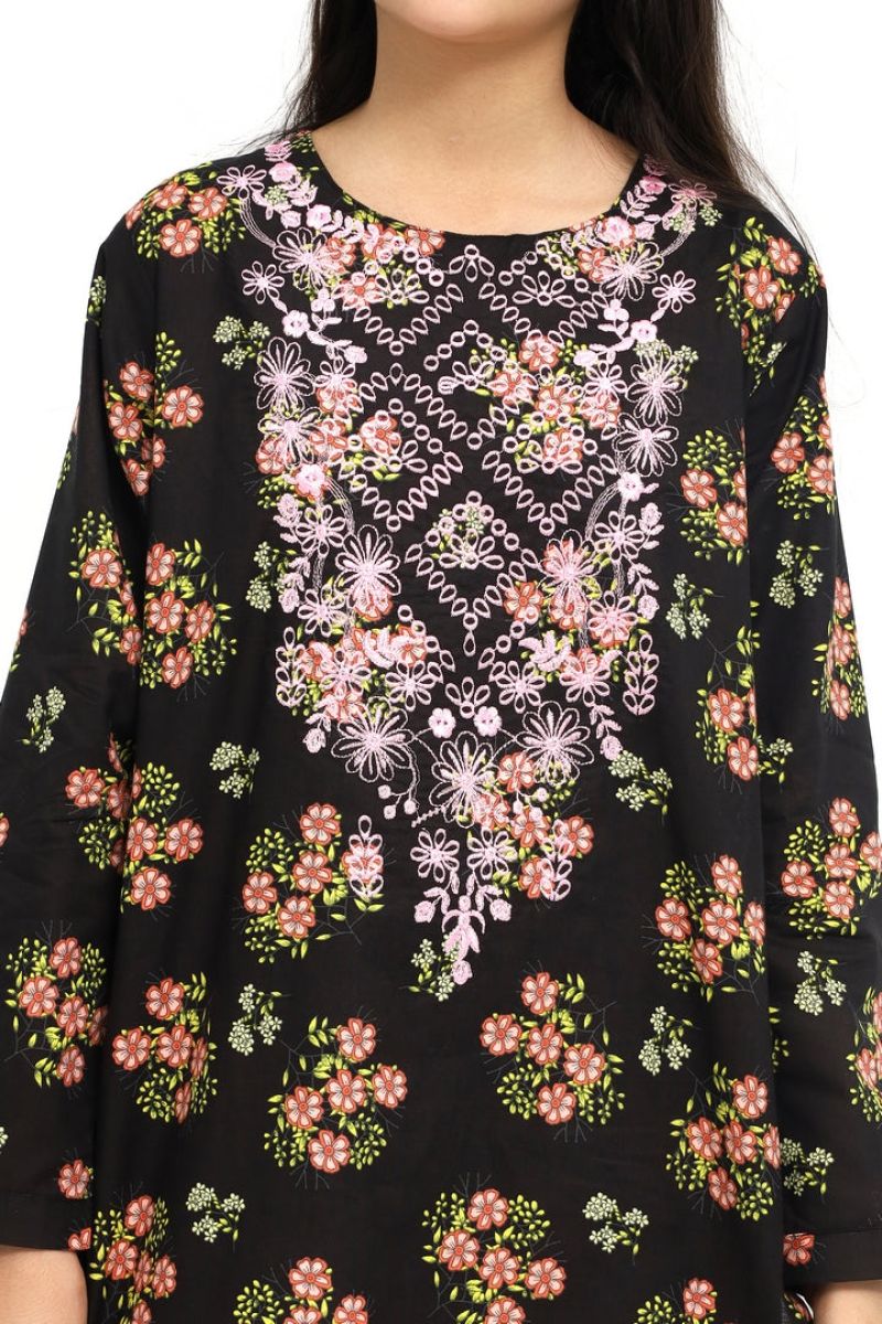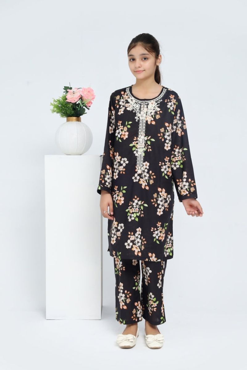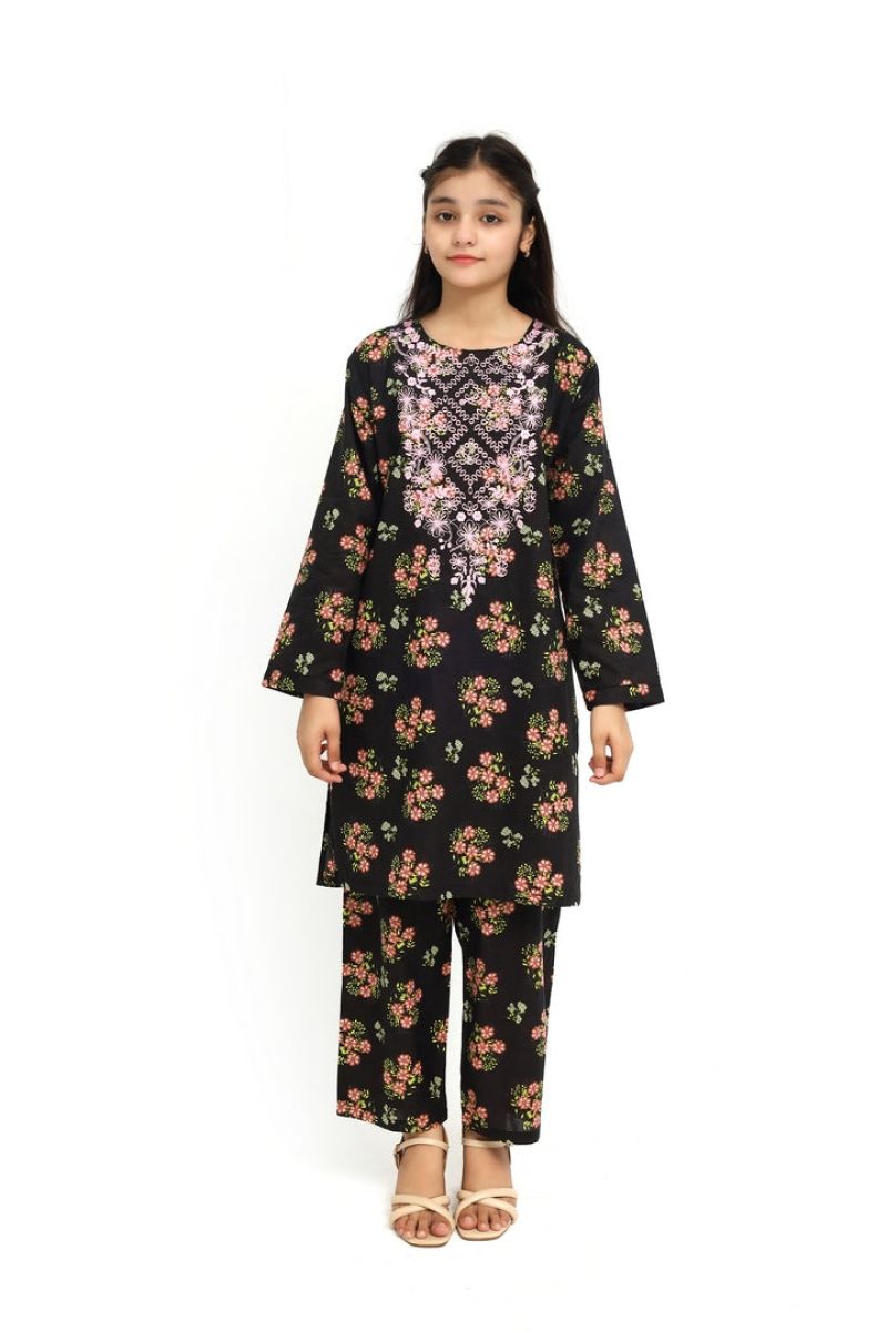 Plum 100% Cotton Lawn Black Colour Printed Almond Biege Flowers Embroidered Off White threads On Stitched 2 pc suit for Girls.