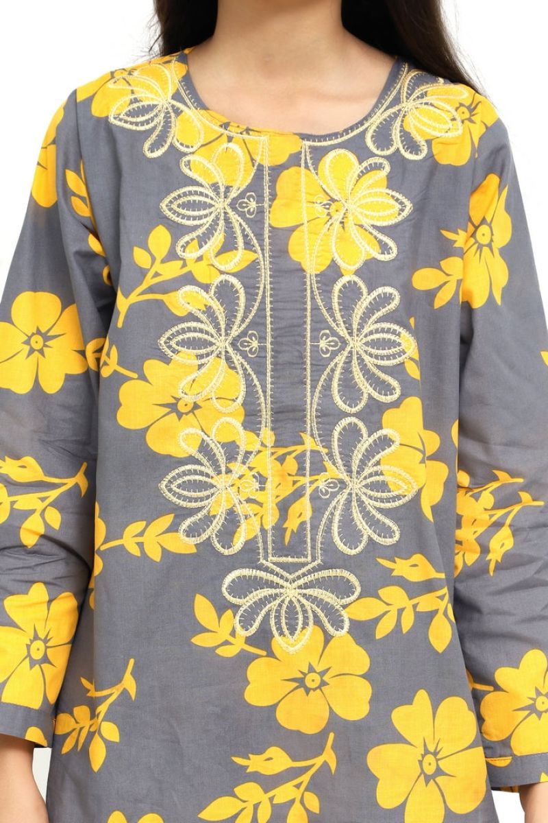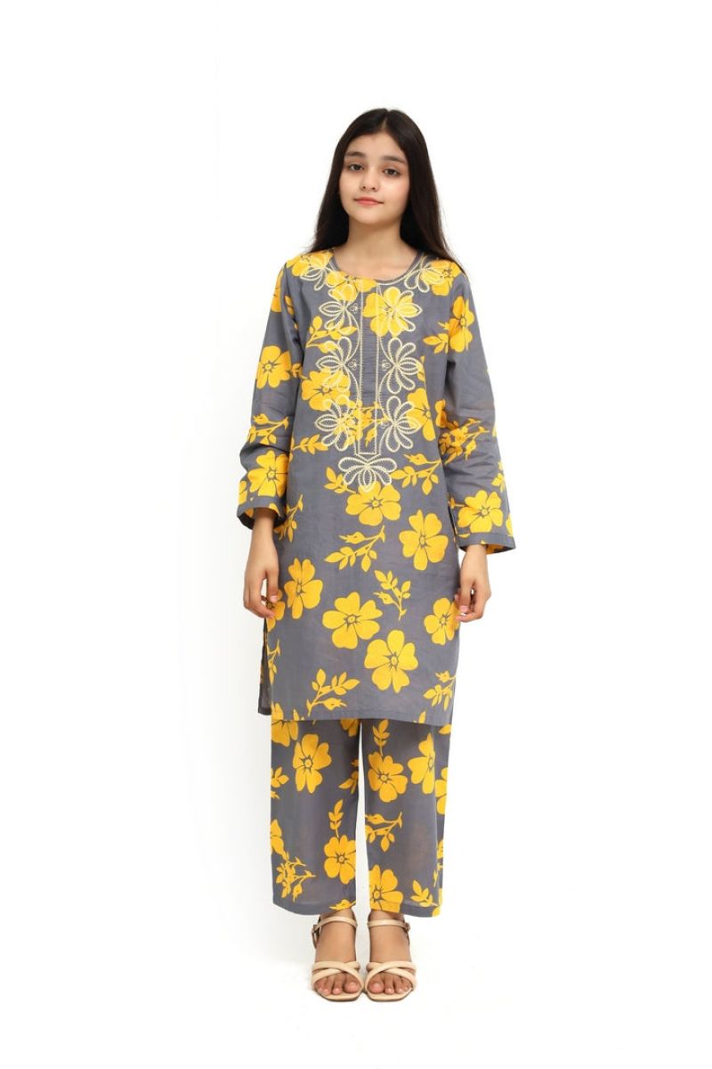 Plum 100% Cotton Lawn Grey Colour Printed Yellow Flowers Embroidered Off White threads On Stitched 2 pc suit for Girls.