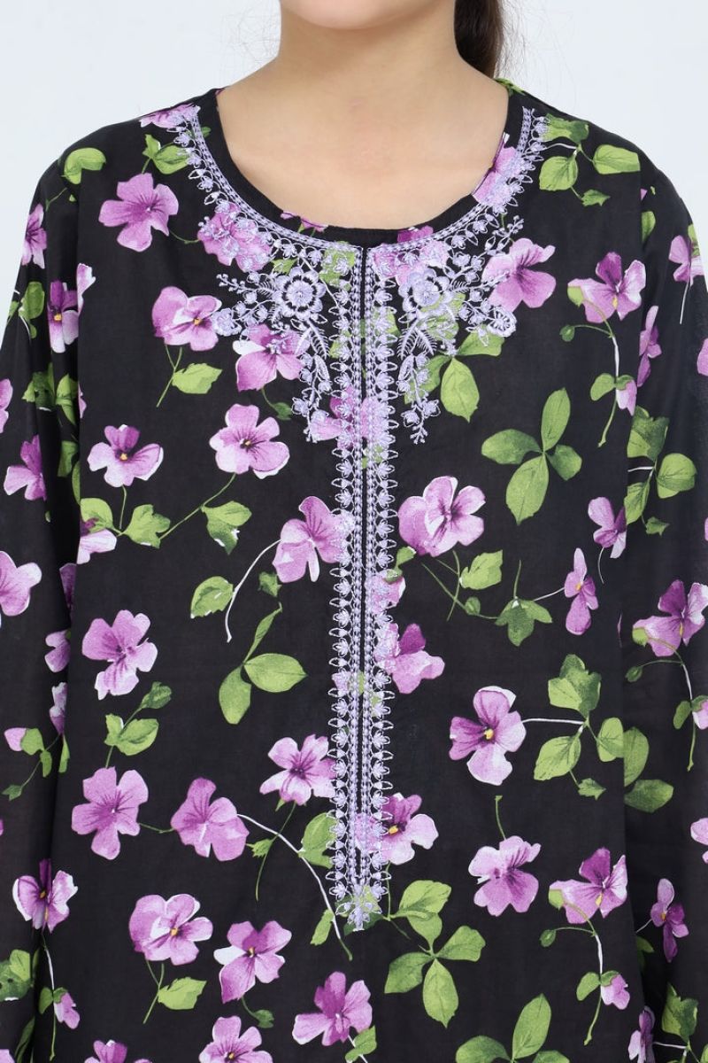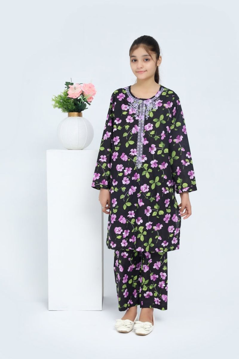 Plum 100% Cotton Lawn Black Colour Printed Purple Green Flowers Embroidered Purple threads On Stitched 2 pc suit for Girls.