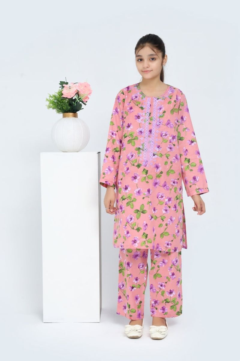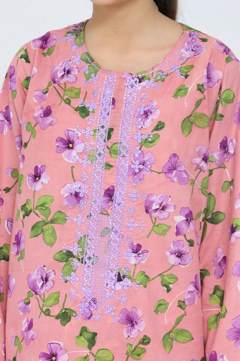 Plum 100% Cotton Lawn Peach Pink Colour Printed Purple Green Flowers Embroidered Purple threads On Stitched 2 pc suit for Girls.