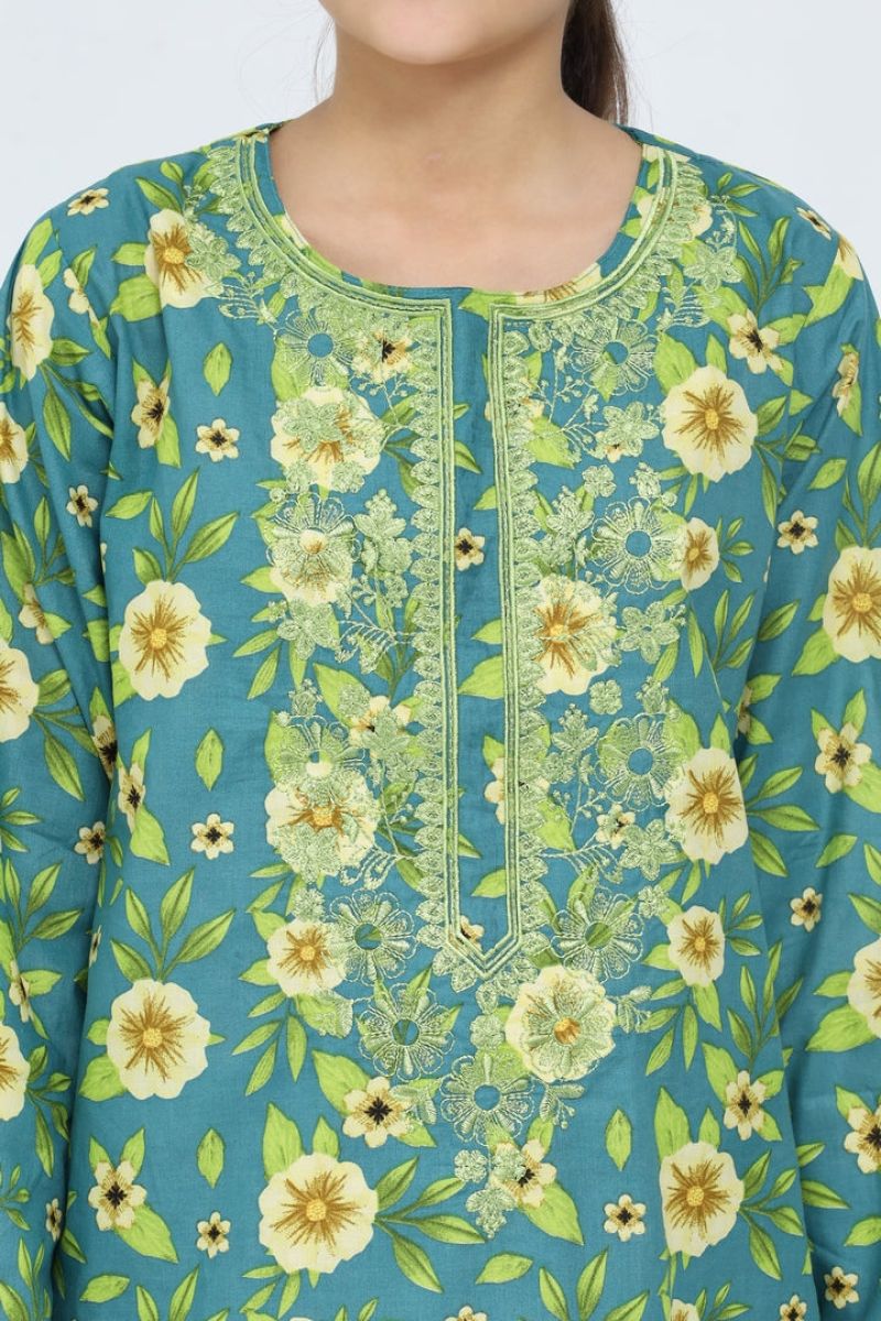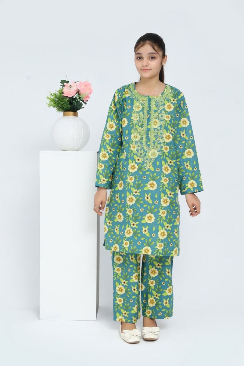 Plum 100% Cotton Lawn Green Colour Printed Yellow Green Flowers Embroidered Green threads On Stitched 2 pc suit for Girls.