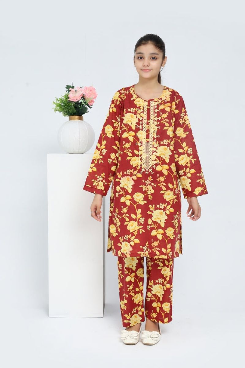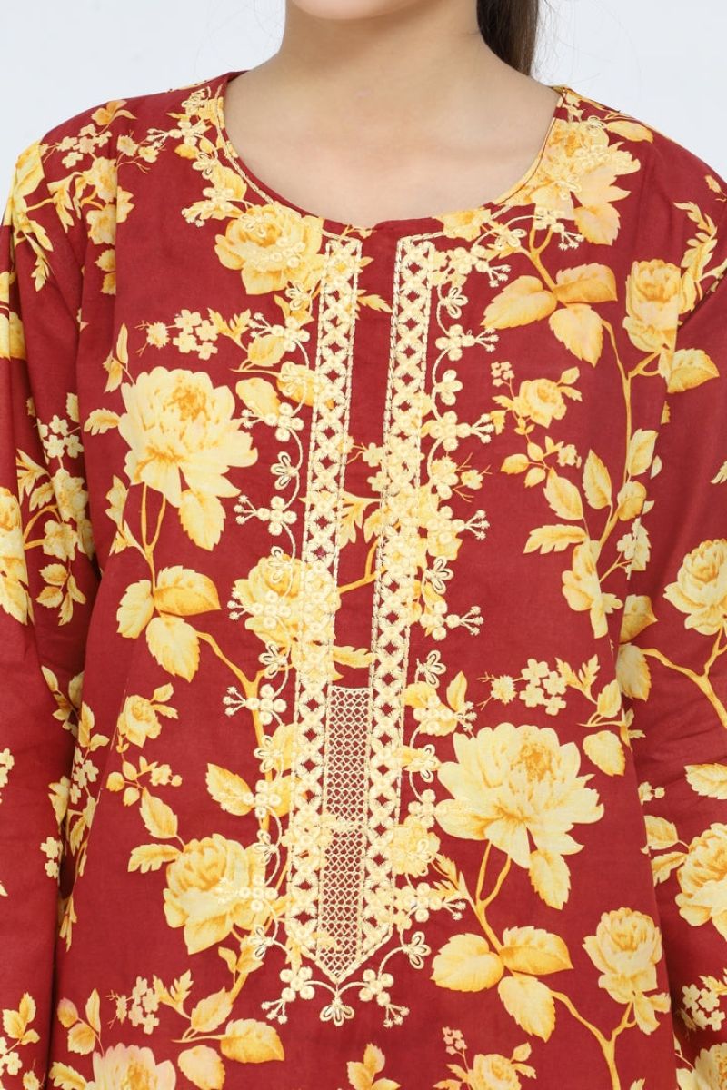 Plum 100% Cotton Lawn Rust Colour Printed Yellow Flowers Embroidered Yellow threads On Stitched 2 pc suit for Girls.
