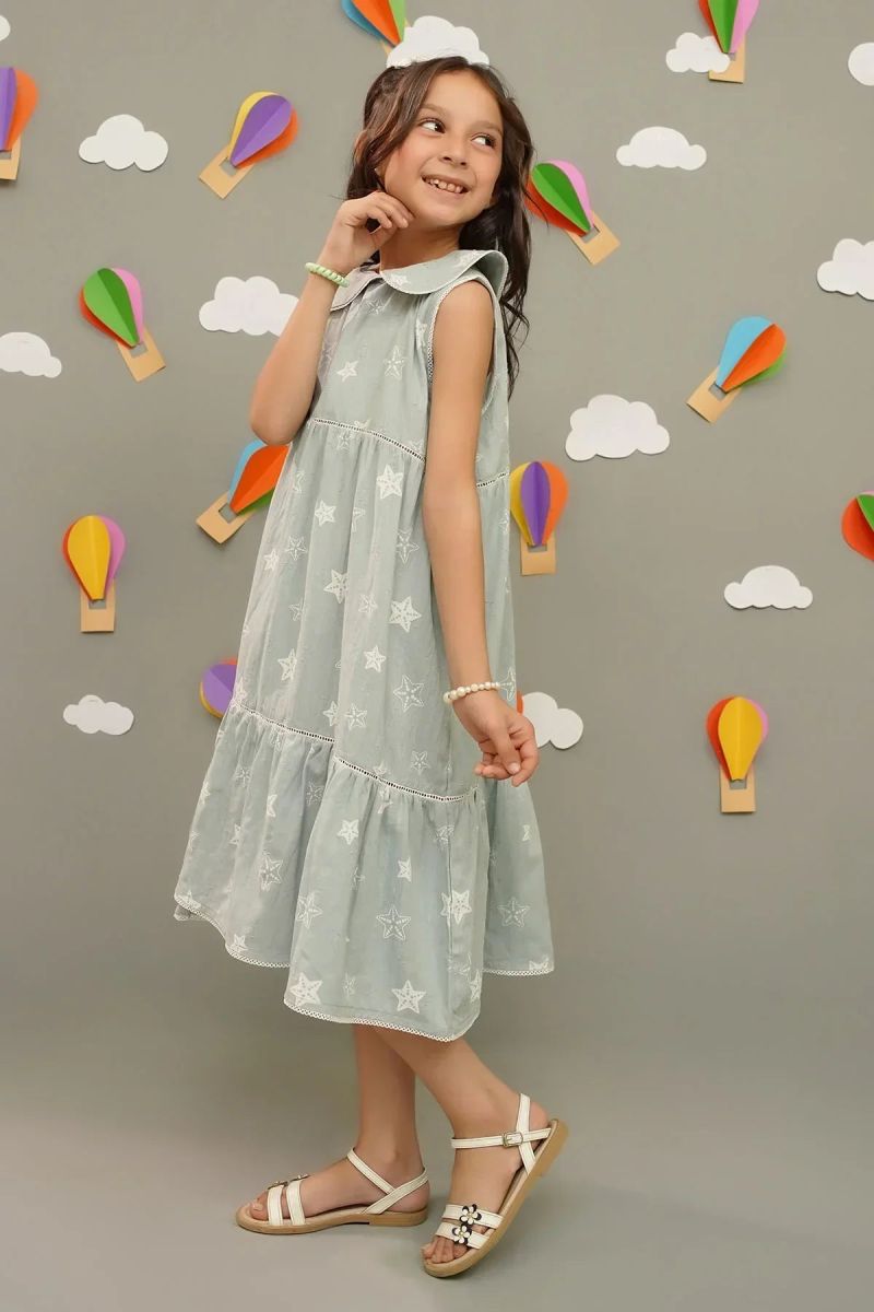 Grey Printed Chambray Dress with Laces