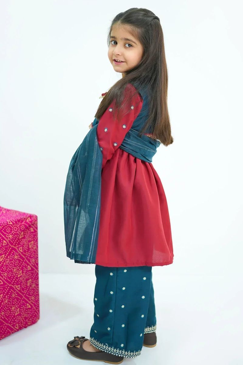 Top: Maroon Raw Silk Kurta & Teal Blue Raw Silk Koti With Embroidery