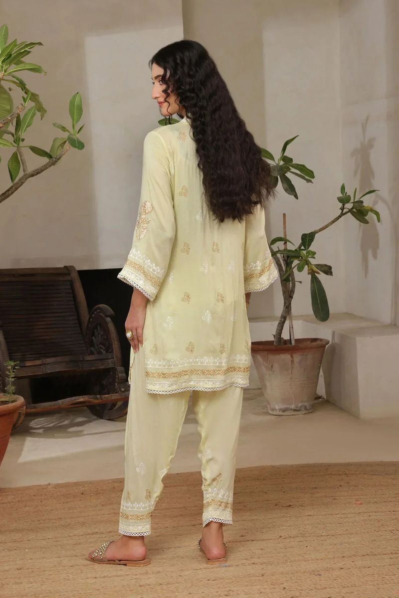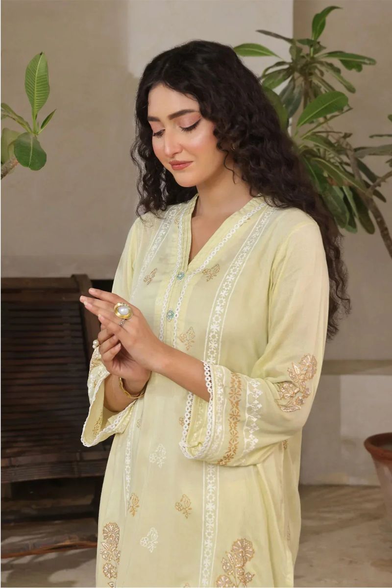 Bottom: Lemon Yellow Rod Silk Shalwar With Block Print
