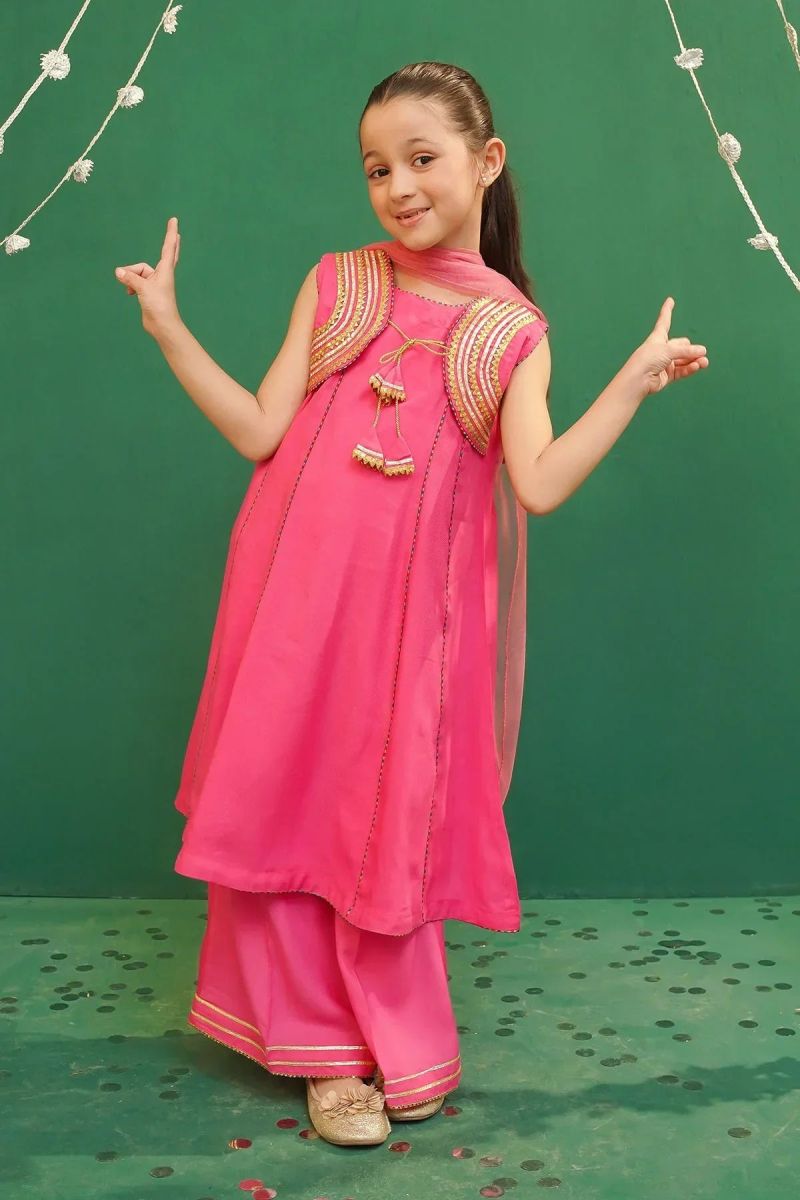 "Top: Hot Pink Rod Silk Sleeveless Kurta with Gota Work on Koti and Tassels