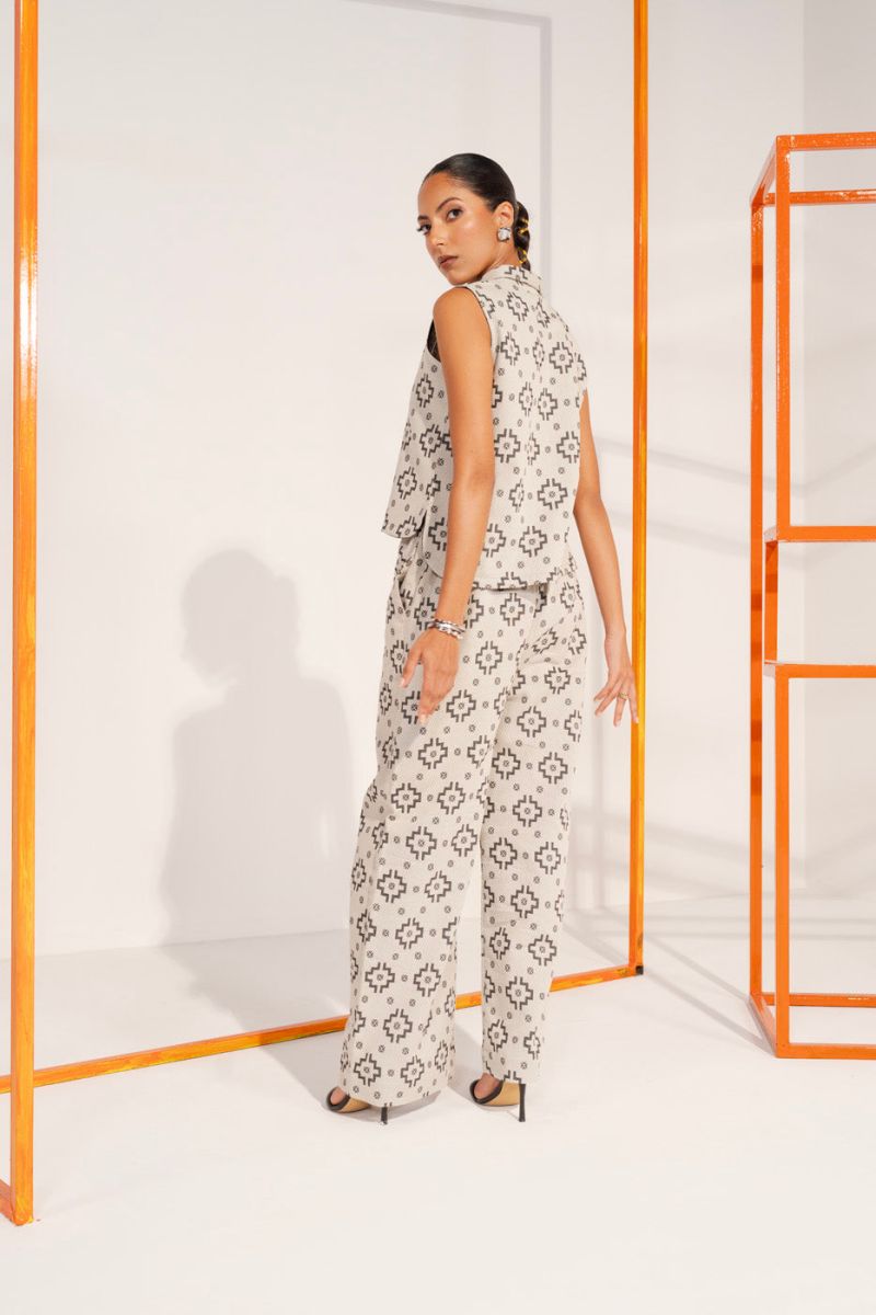 This printed cropped top features a sleeveless design and a button-down silhouette. Made from jacquard fabric, it offers a comfortable fit and stylish look perfect for any occasion.