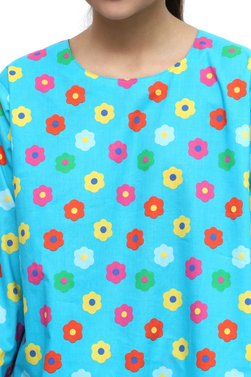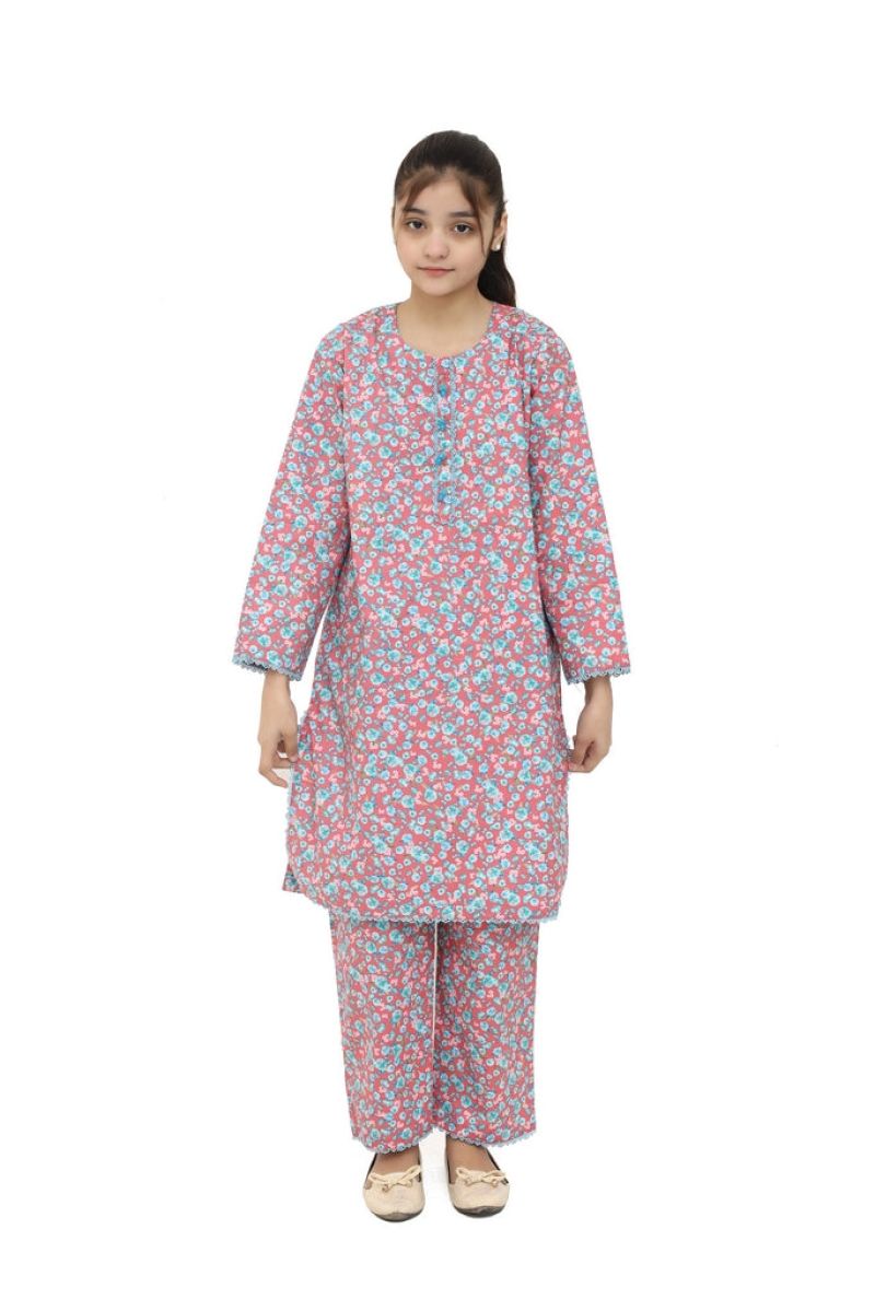 Plum Digital Lawn Sky Blue Colour Printed Red Yellow Pink Flowers on 2 Pc stitched suit for Girls.