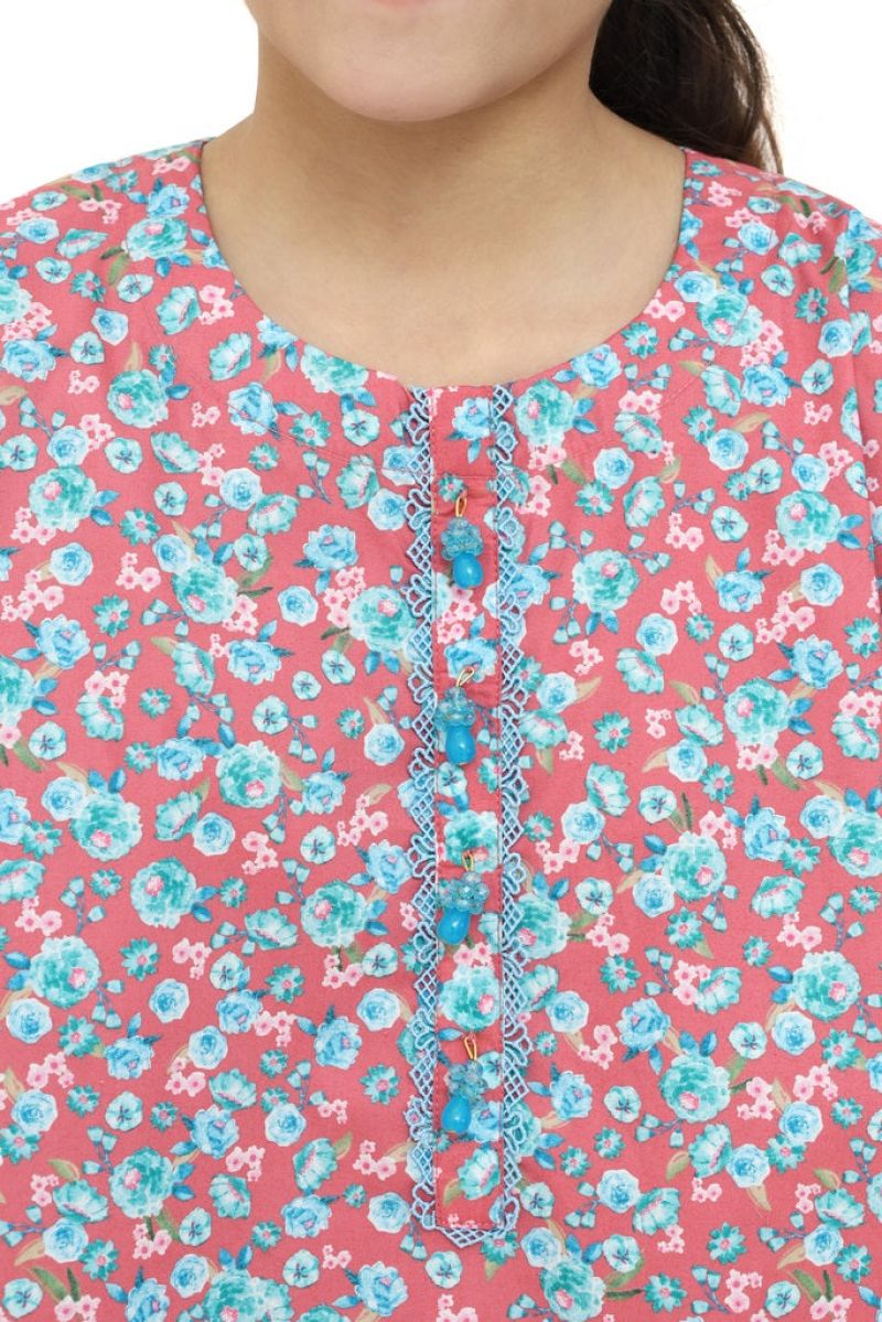 Plum Digital Cotton Lawn Peach Colour Printed Pink Green Sky Blue Flowers Embelished Blue Tassels & Laces on 2 Pc stitched suit for Girls.