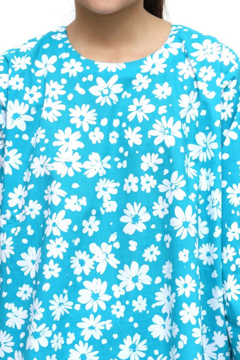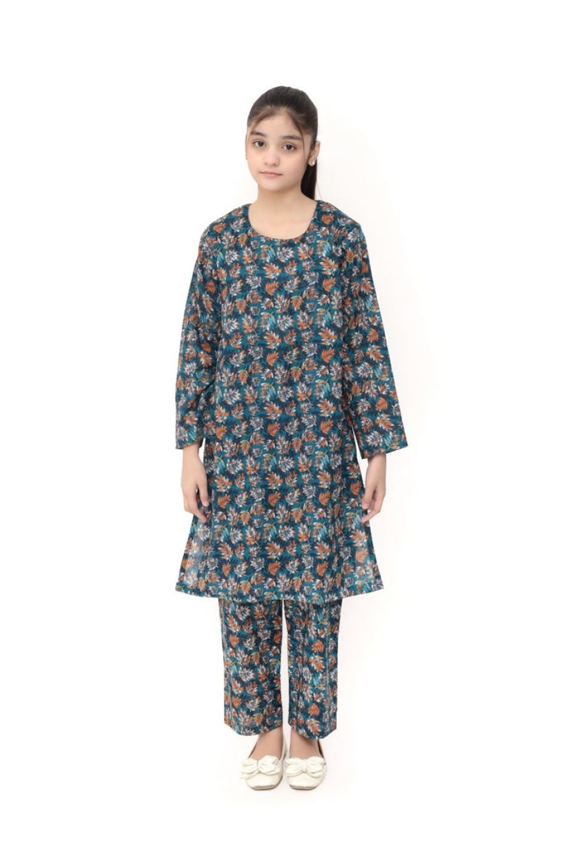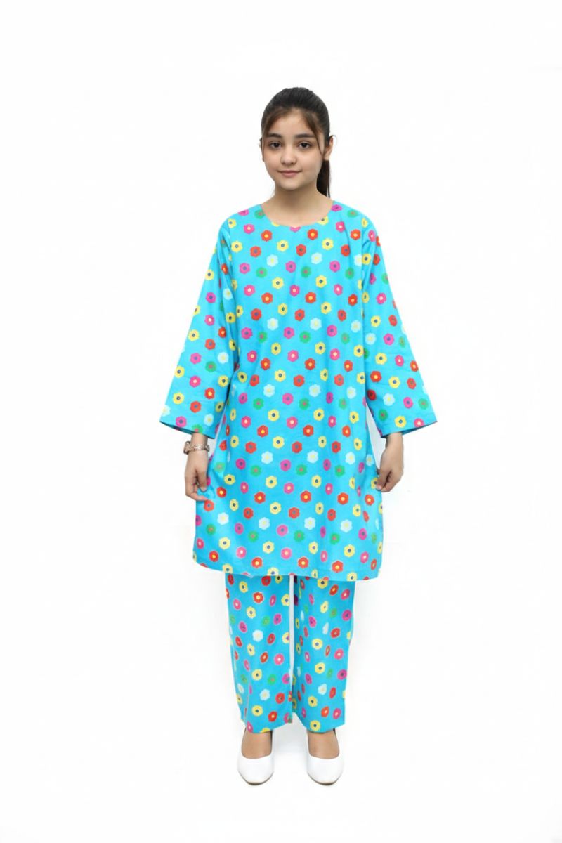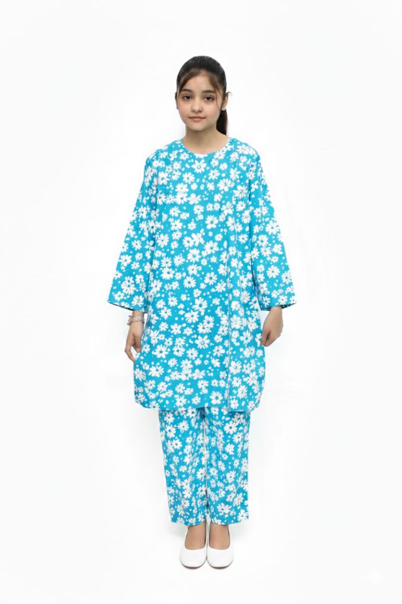 Plum Digital Lawn Sky Blue Colour Printed White Flowers on 2 Pc stitched suit for Girls.
