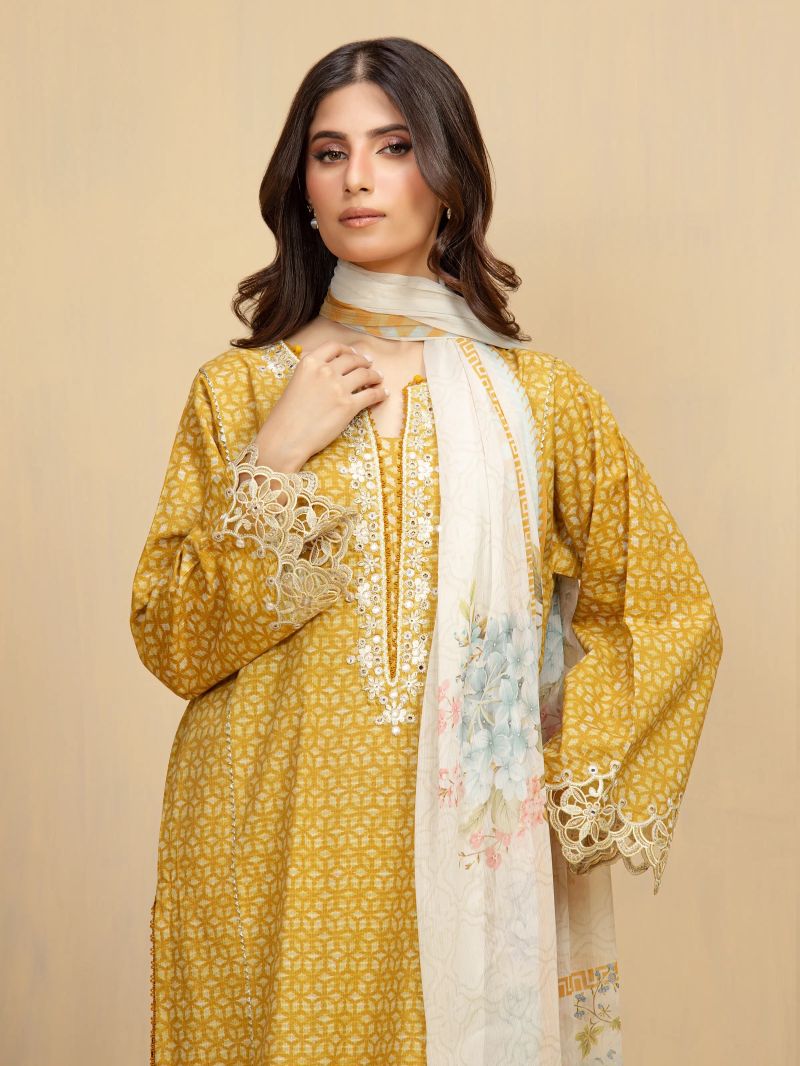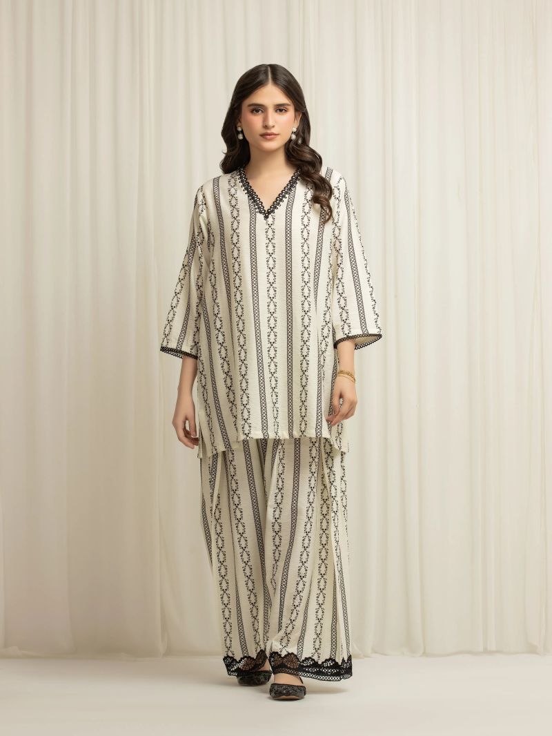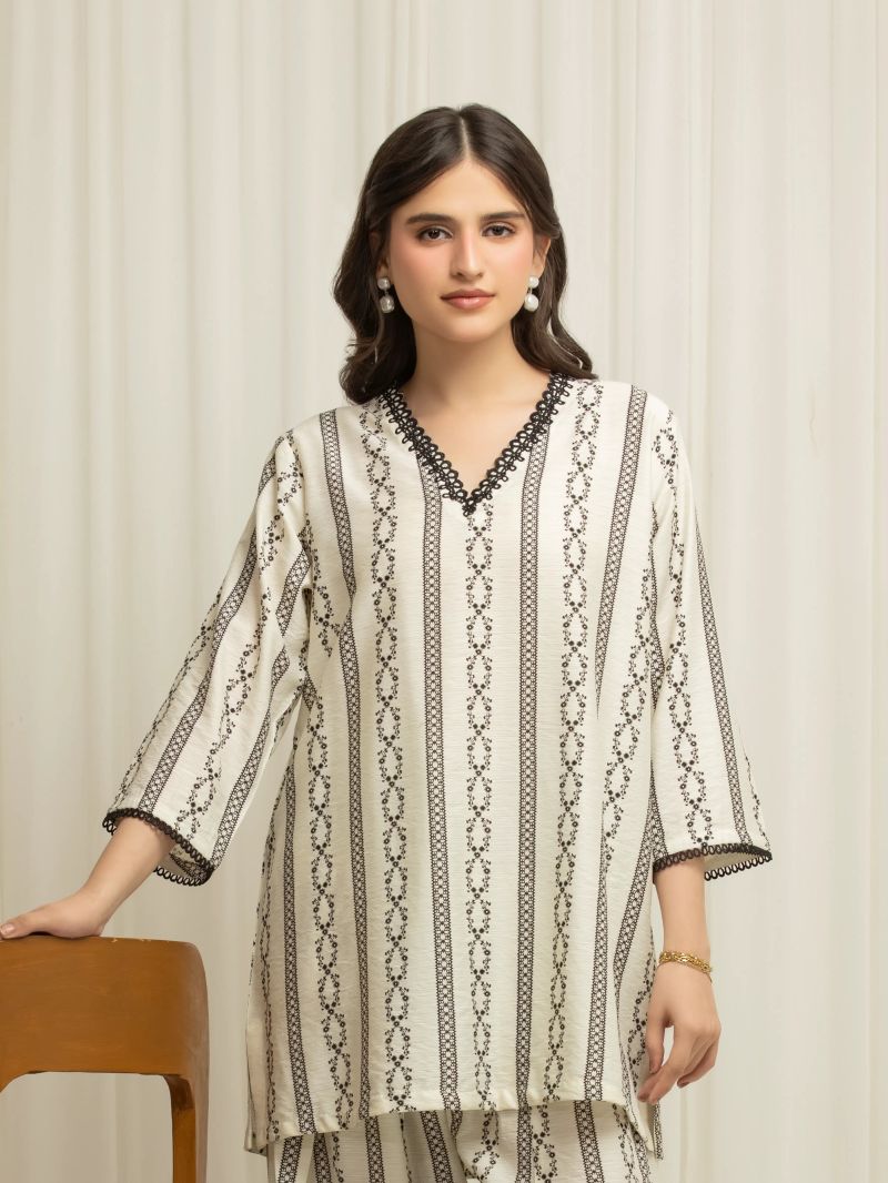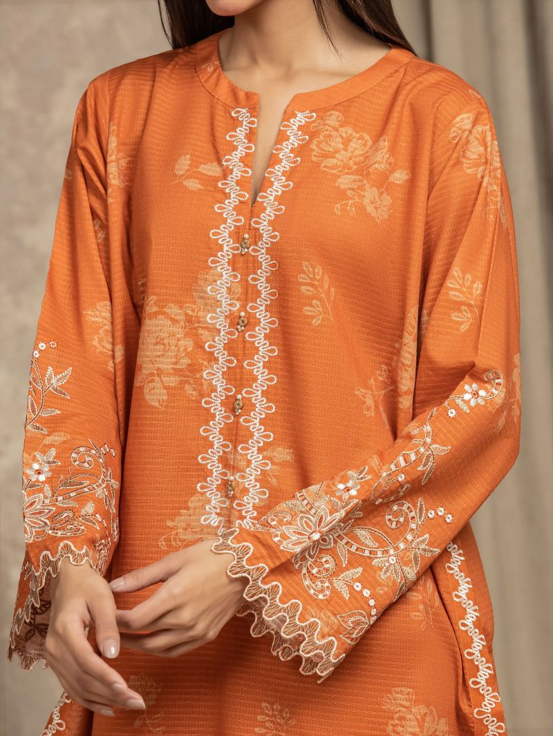 Top: Peach Slub Lawn Kurta With Crotia Laces