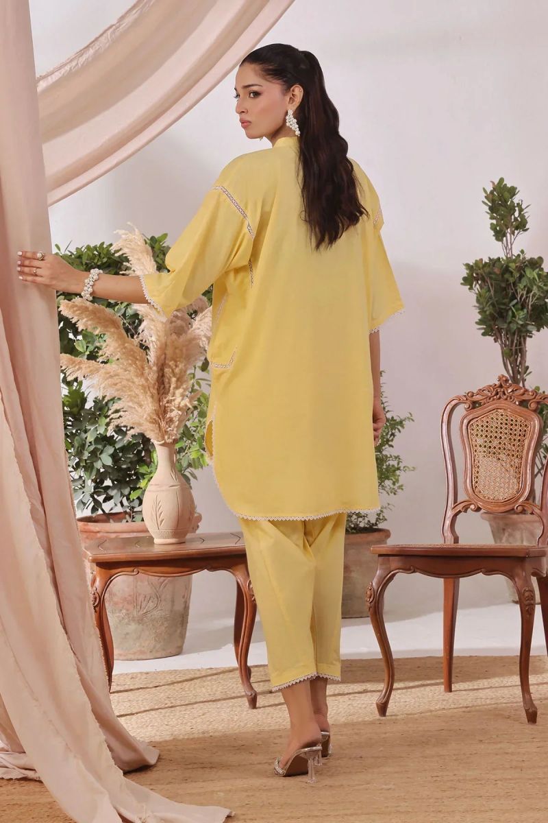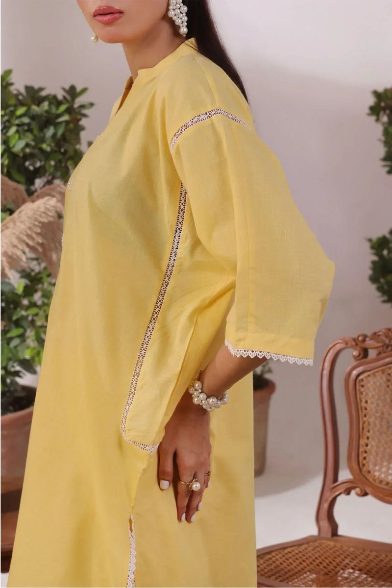 Top: Yellow Slub Lawn Kurta With Ctoria Laces