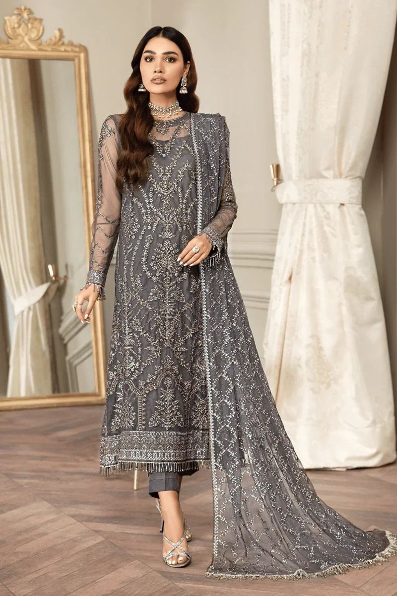 Curated on a grey base, this ensemble is a combination of bold and gallant disposition of colors. Embroidered in thread work of matte silver sequins, it is beauty to behold. It comes paired with a grey embroidered dupatta and tonal trouser.