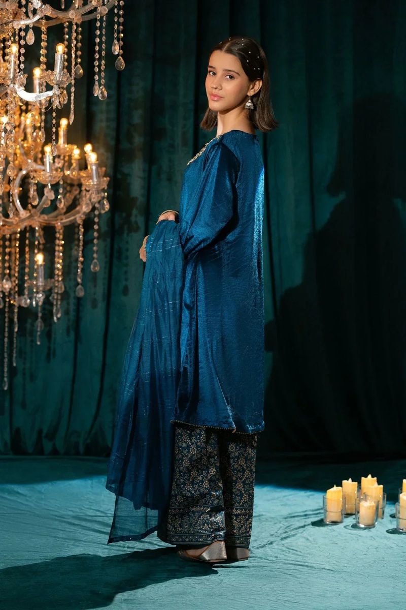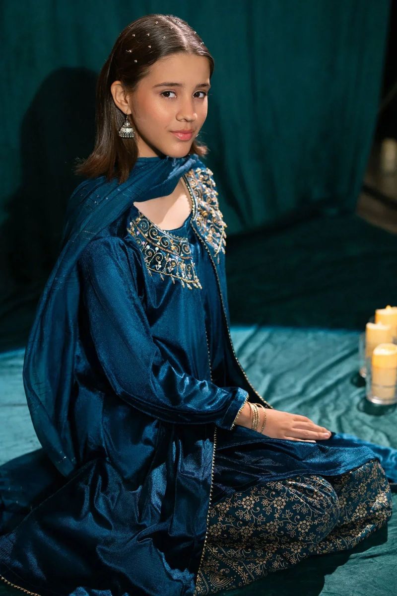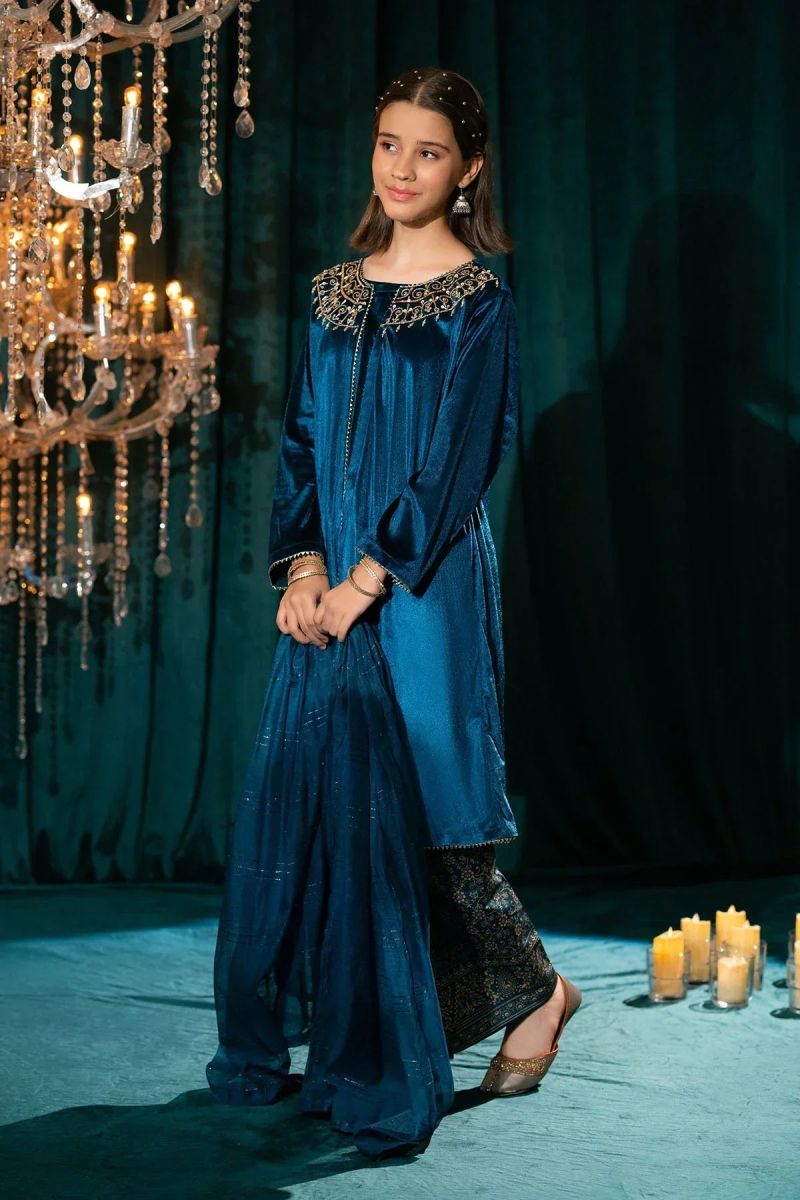Top: Teal Blue Velvet Kurta With Hand Adda Work and Laces
