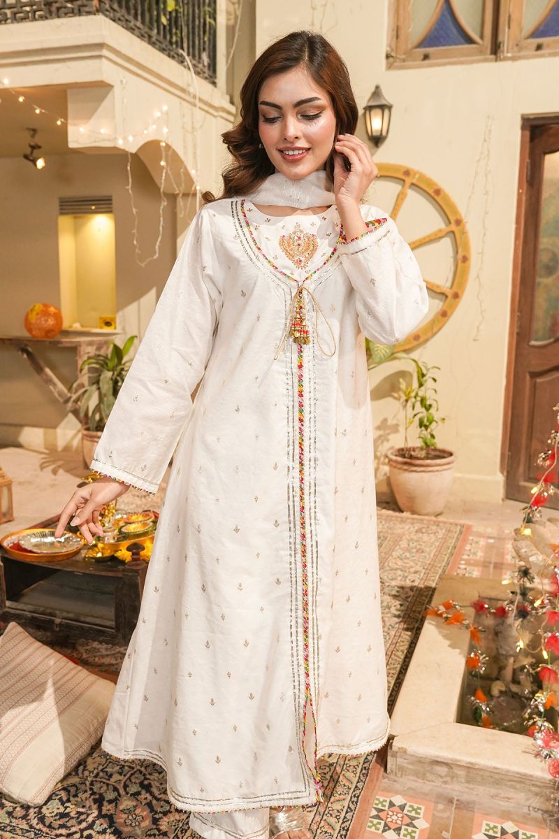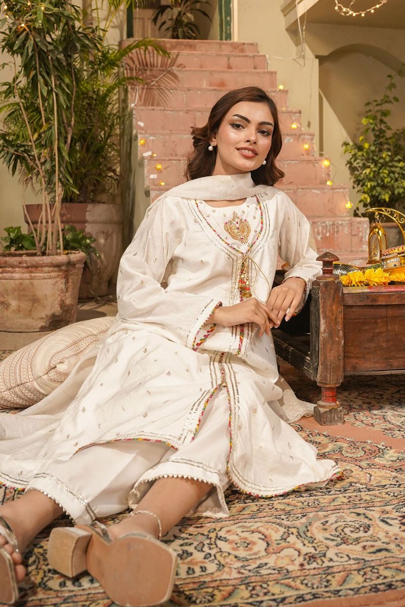 Top: Ivory White Viscose Jacquard Maxi With Hand Adda Work, Tassels, Gota Laces With Malai Crepe Lining