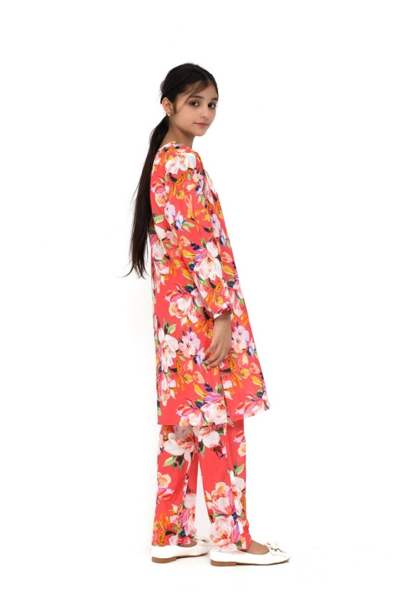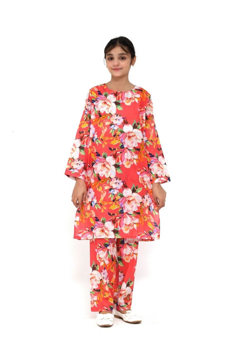 Plum Fine Lawn Coral Colour Printed White Pink Flowers On 2 pc suit For Girls.