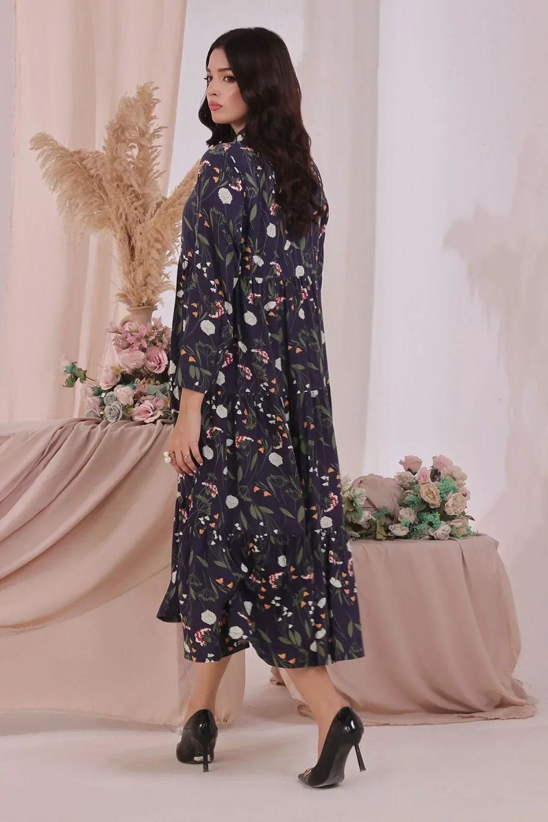 Top: Navy Blue Blue Printed Boski Linen Long Dress