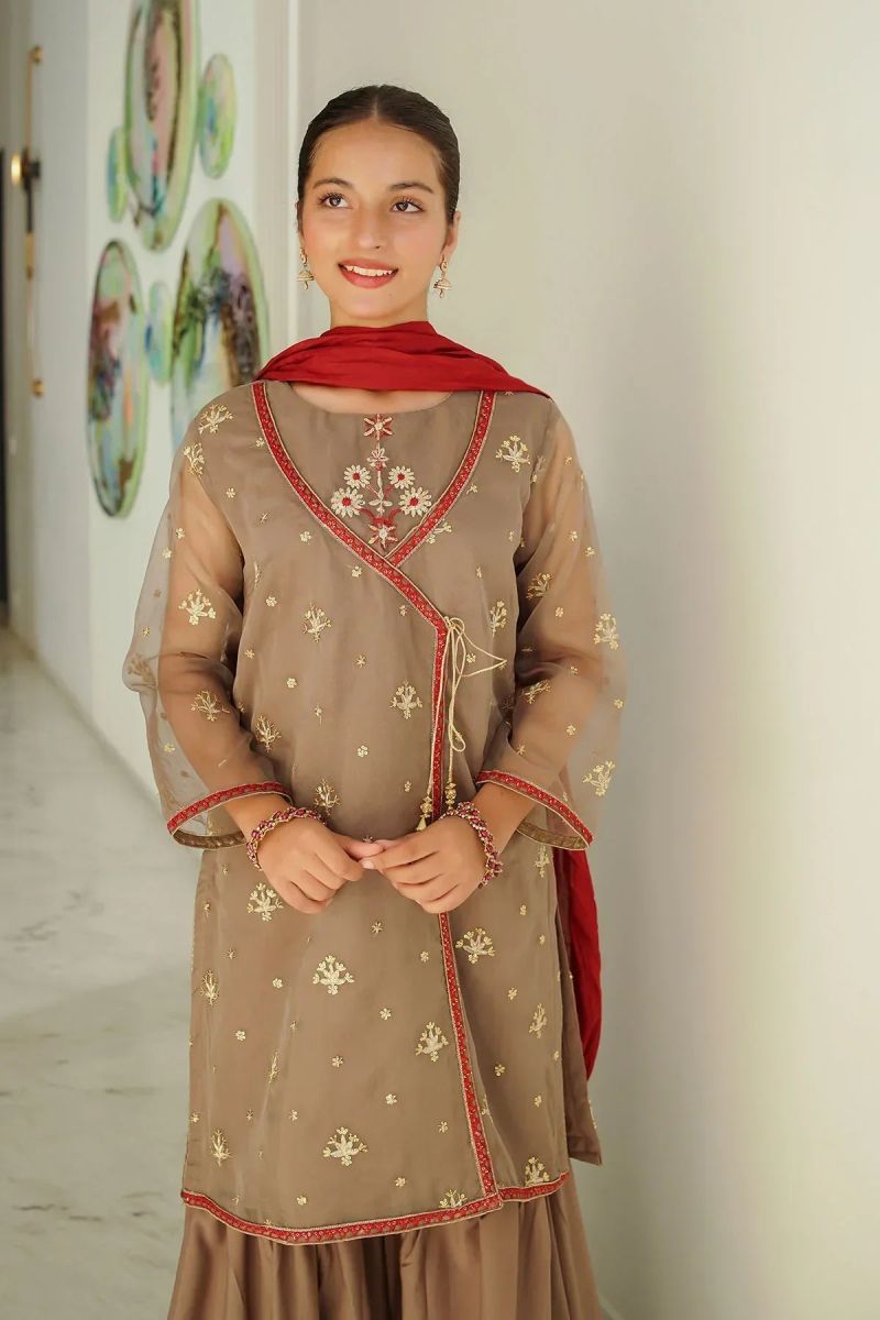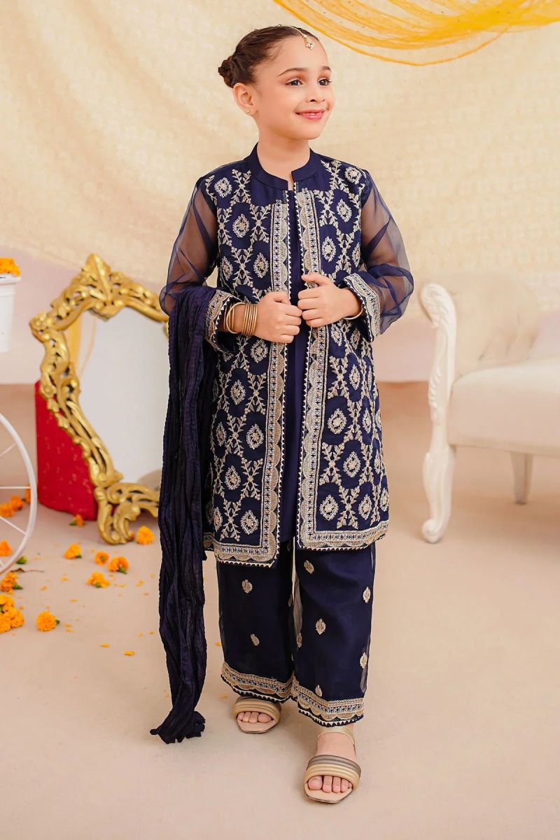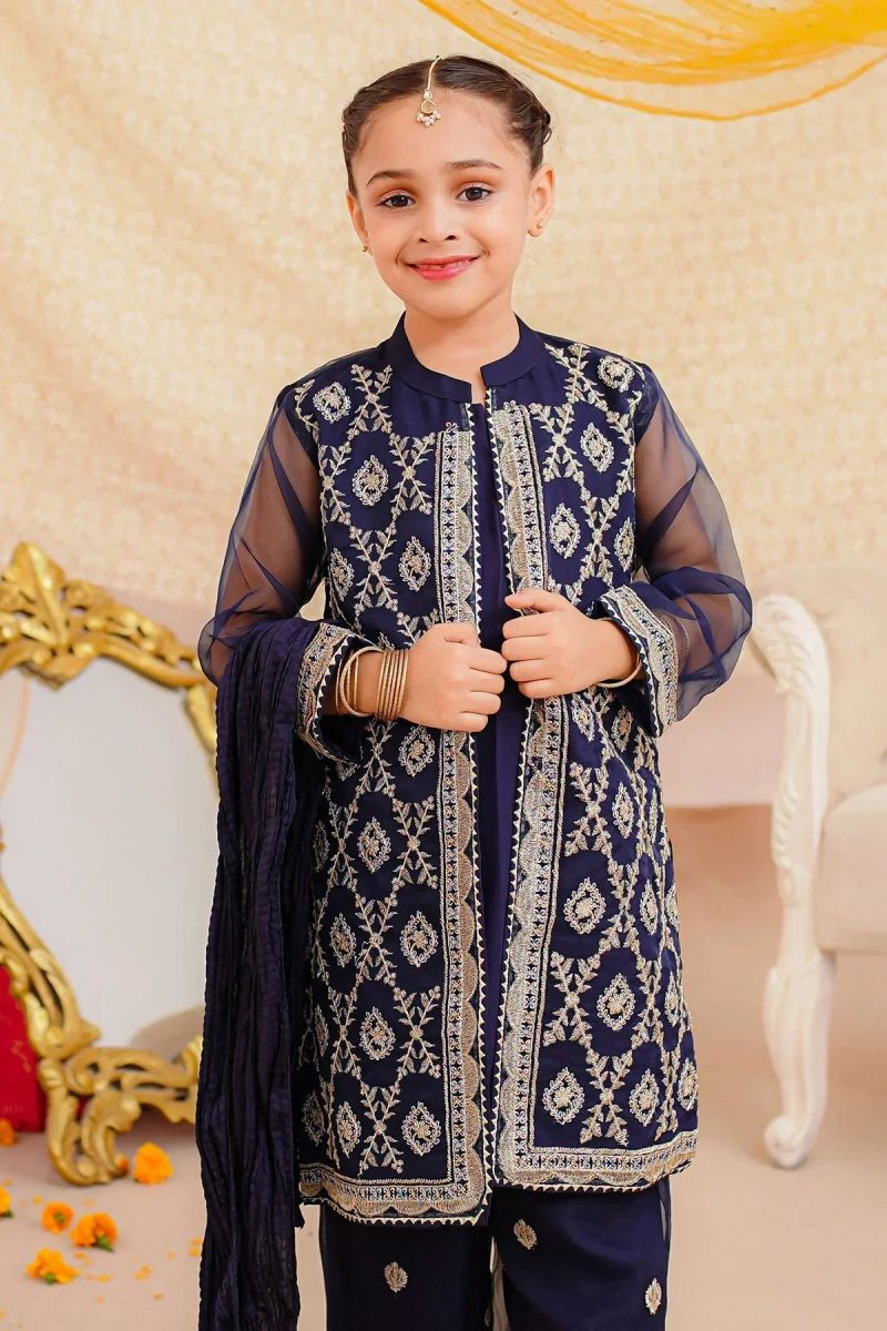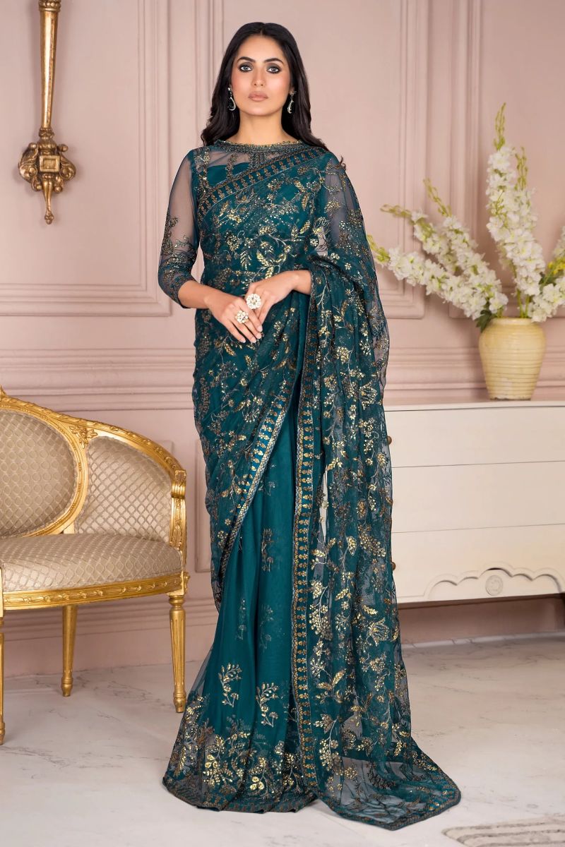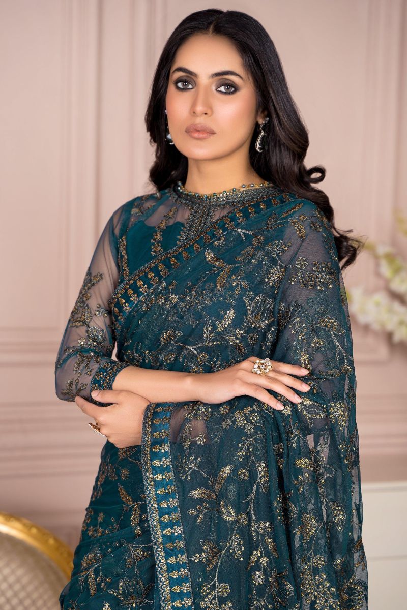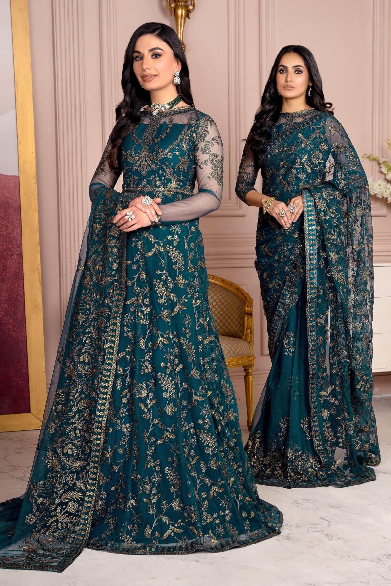 Rendered in a zinc shade, this ensemble features a net canvas gracefully adorned in gold sequins and embroideries which can be worn as different styles such as saree, mexi and lehnga. It comes with heavily embroidered dupatta giving it an eye catchy appeal.