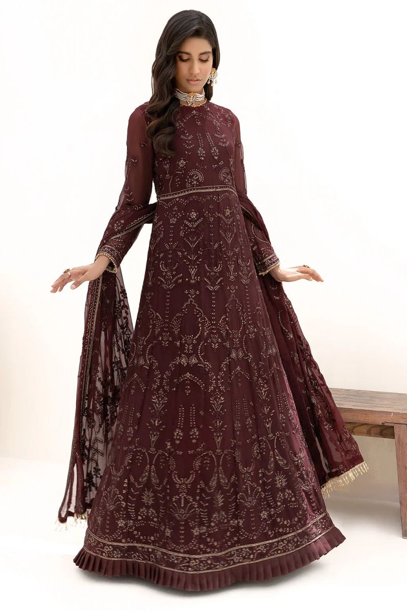 Minimalistic and artful composition is crafted onto this beautiful fabric styles as mexi. This ensemble is a subtle design featuring threadwork and matte sequins. Paired with an embroidered dupatta and tonal trouser this look is a must to your formal wardrobe.